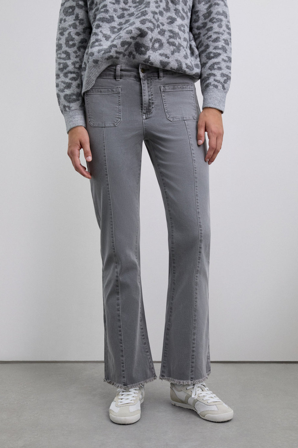 Schlaghose aus BCI-Baumwolle. Mit Reißverschluss mit Knopf. Gürtelschlaufen am Bund. Taschen vorne und Gesäßtaschen. Ziernaht auf der Vorderseite. Seitenschlitz und ausgefranste Saumenden.