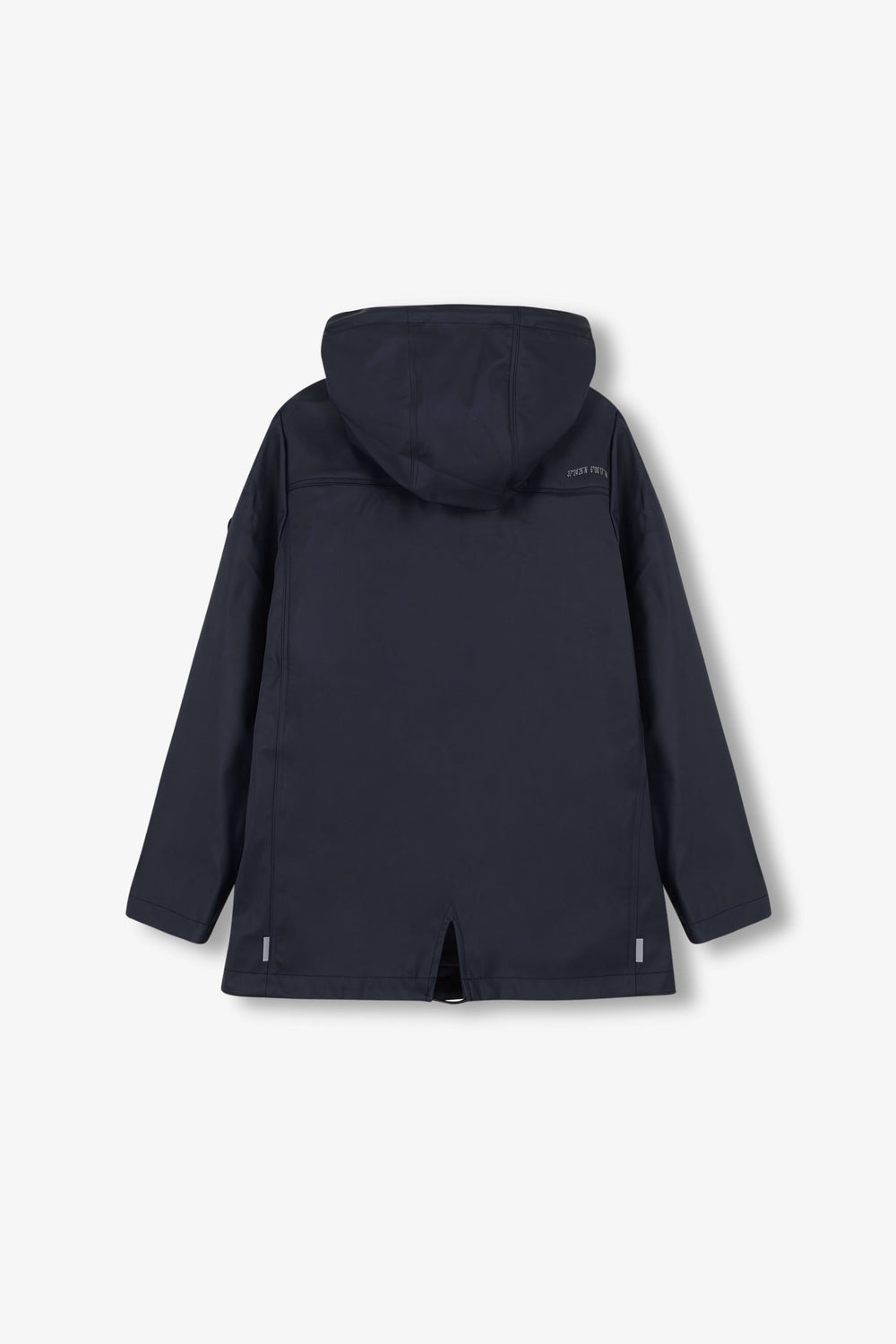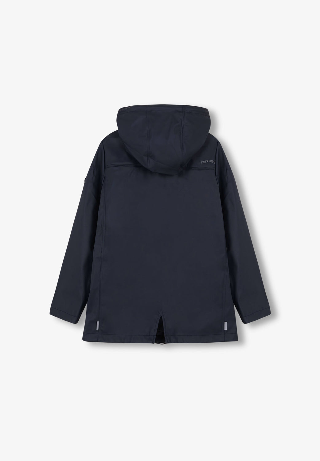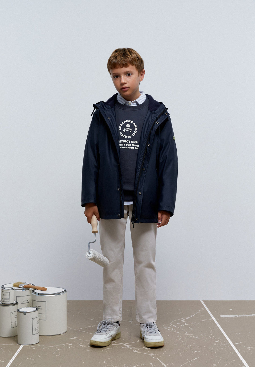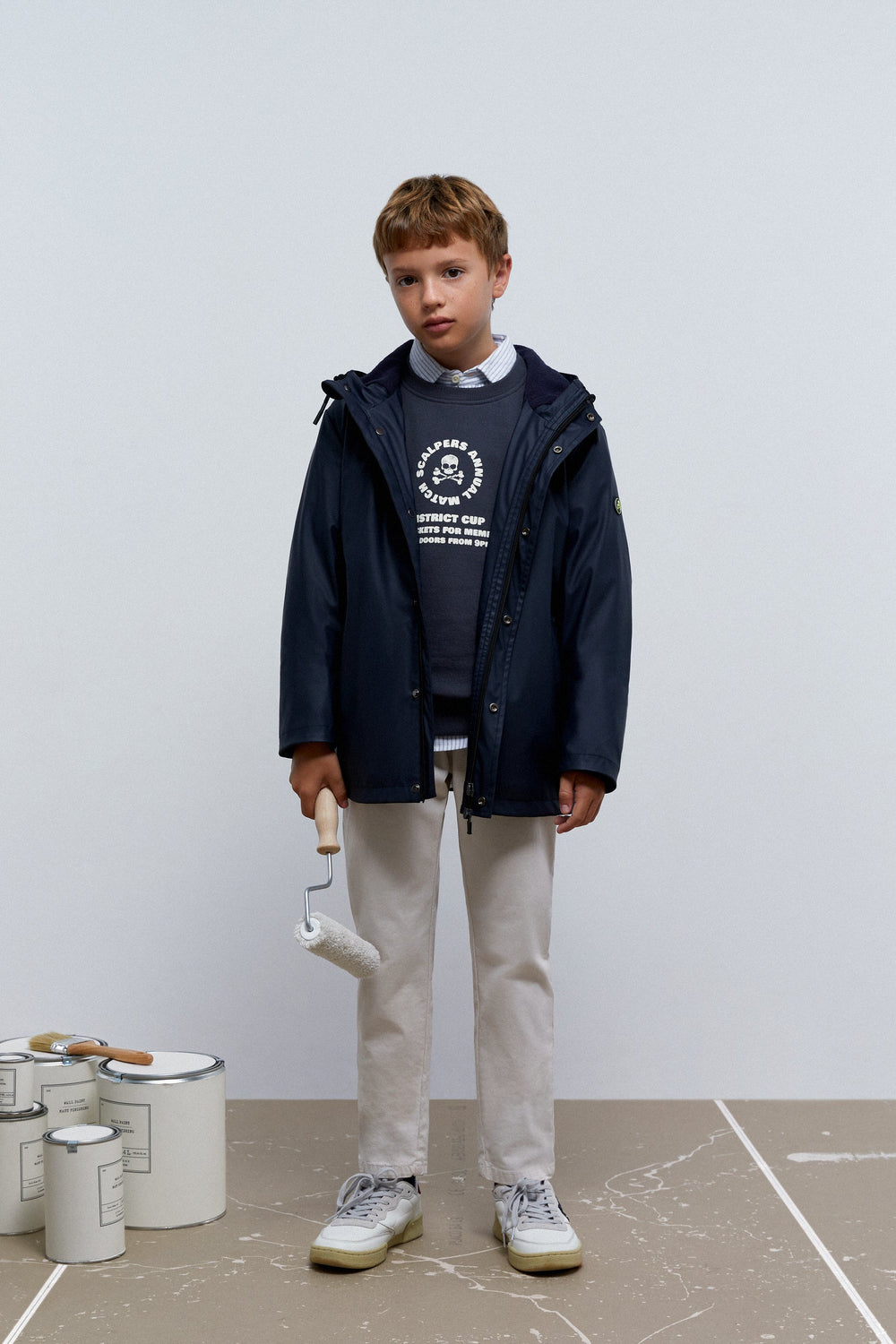 - Double slider thermo-sealed zip and flap pockets with snap button fastening