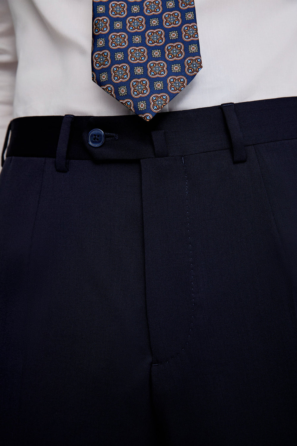 • Pantalón recto con cierre de botón prolongado en cintura y cremallera. Trabillas en cintura y bajo sencillo