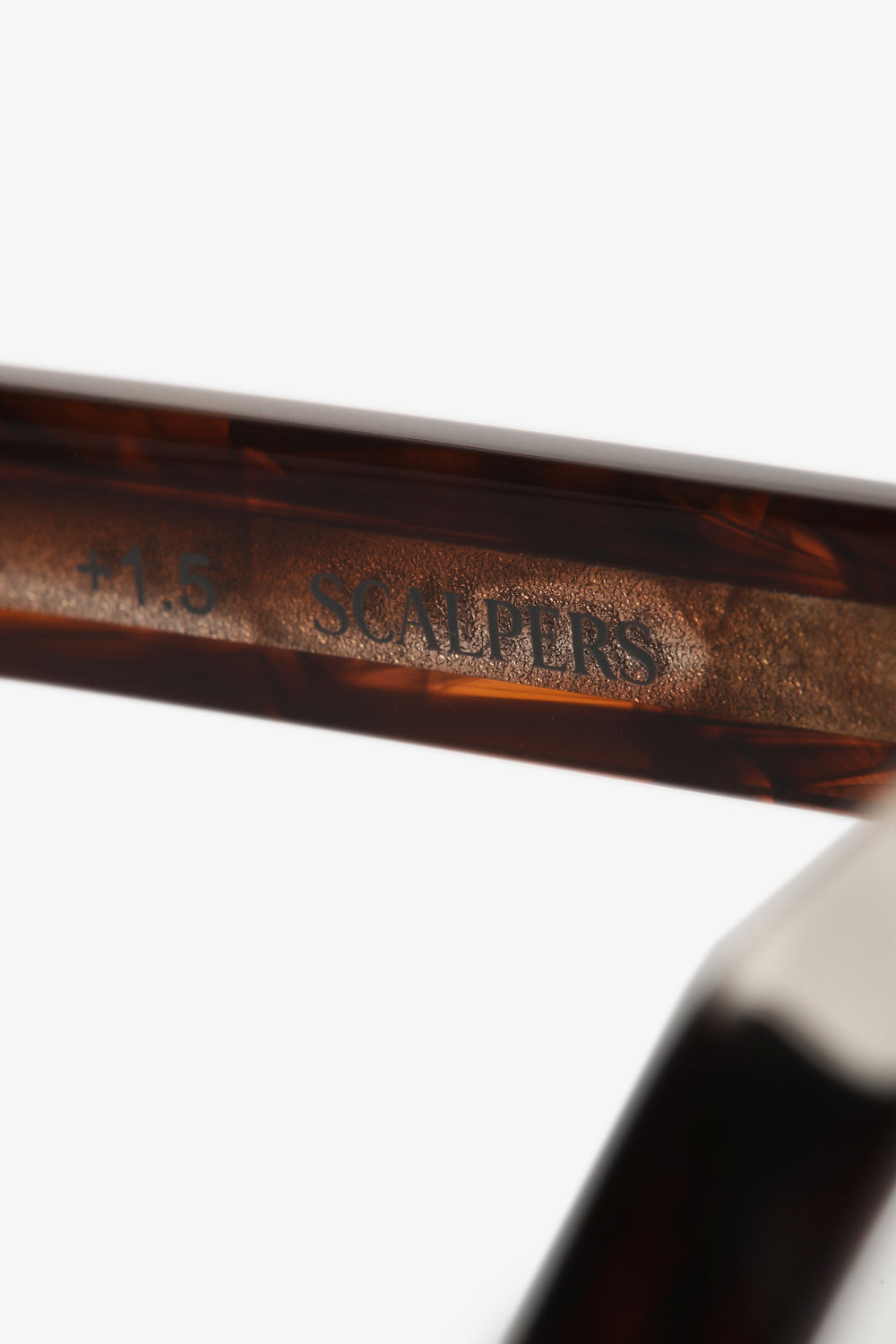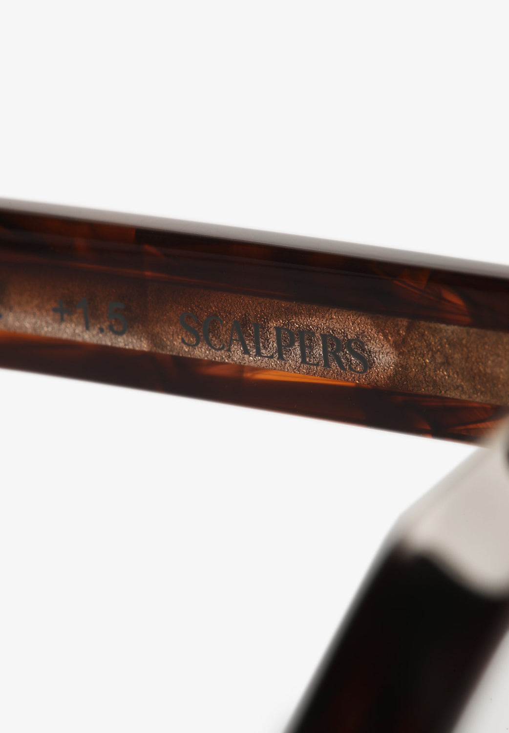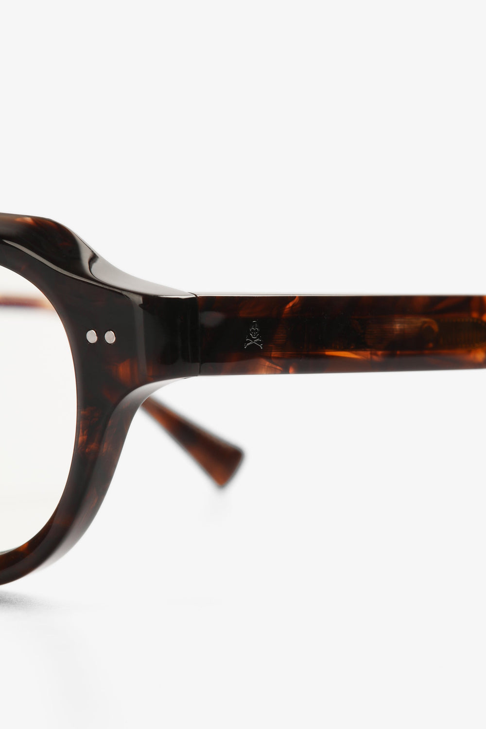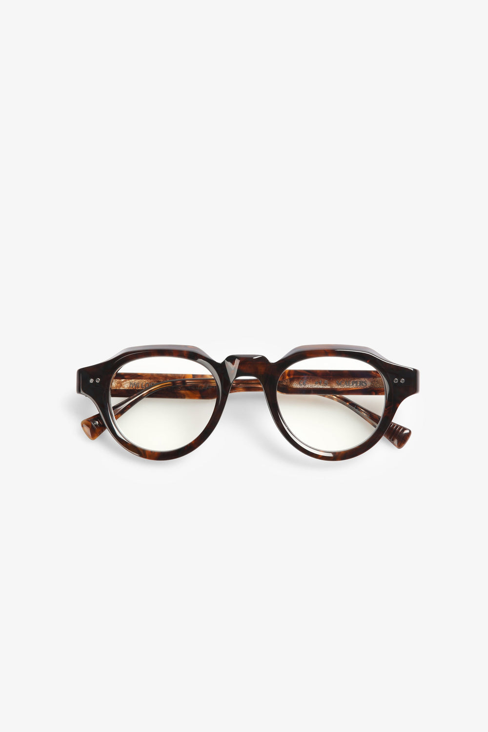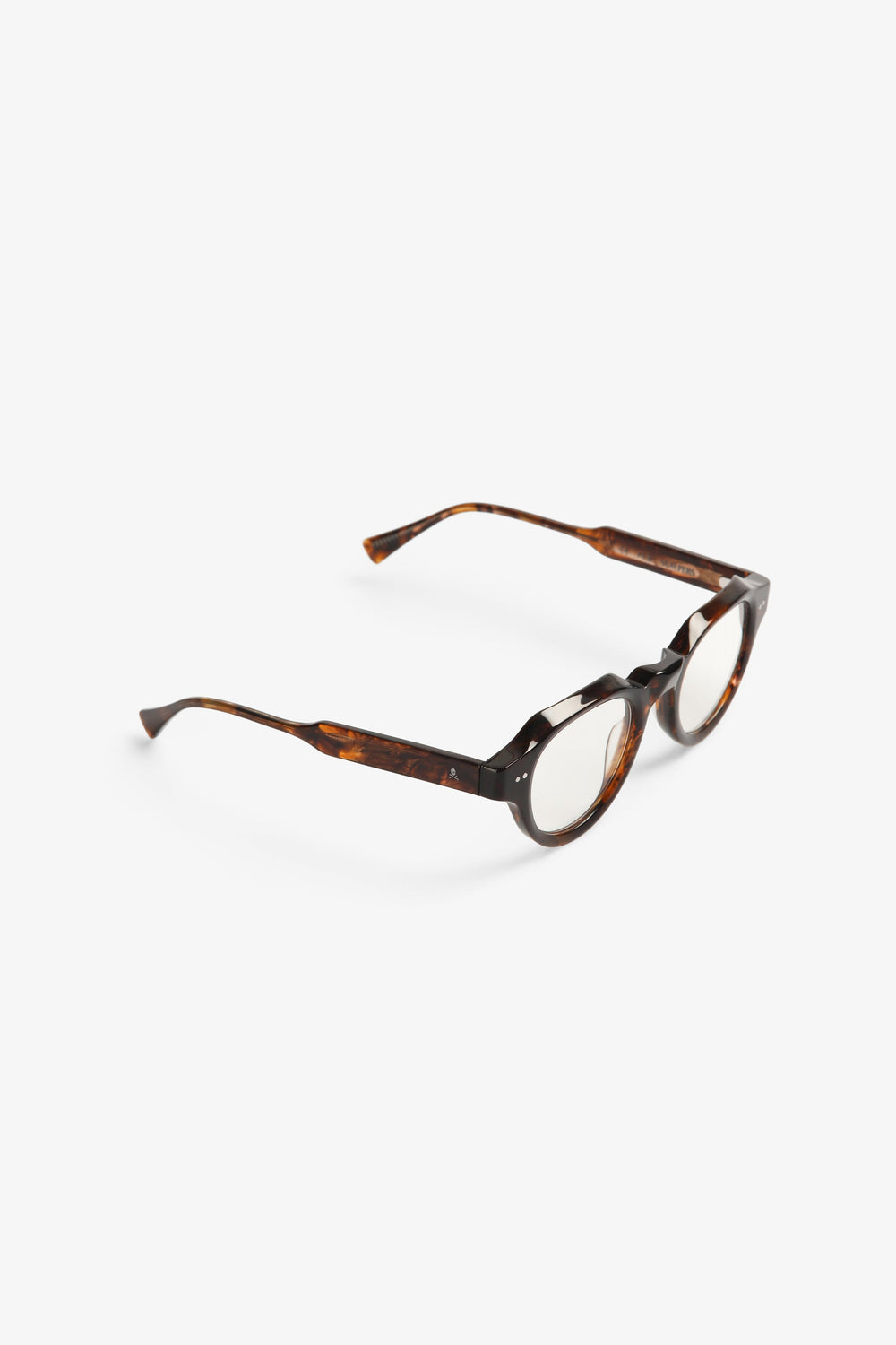 Round acetate glasses, horseshoe bridge. Havana colour. Prescription clear lenses.