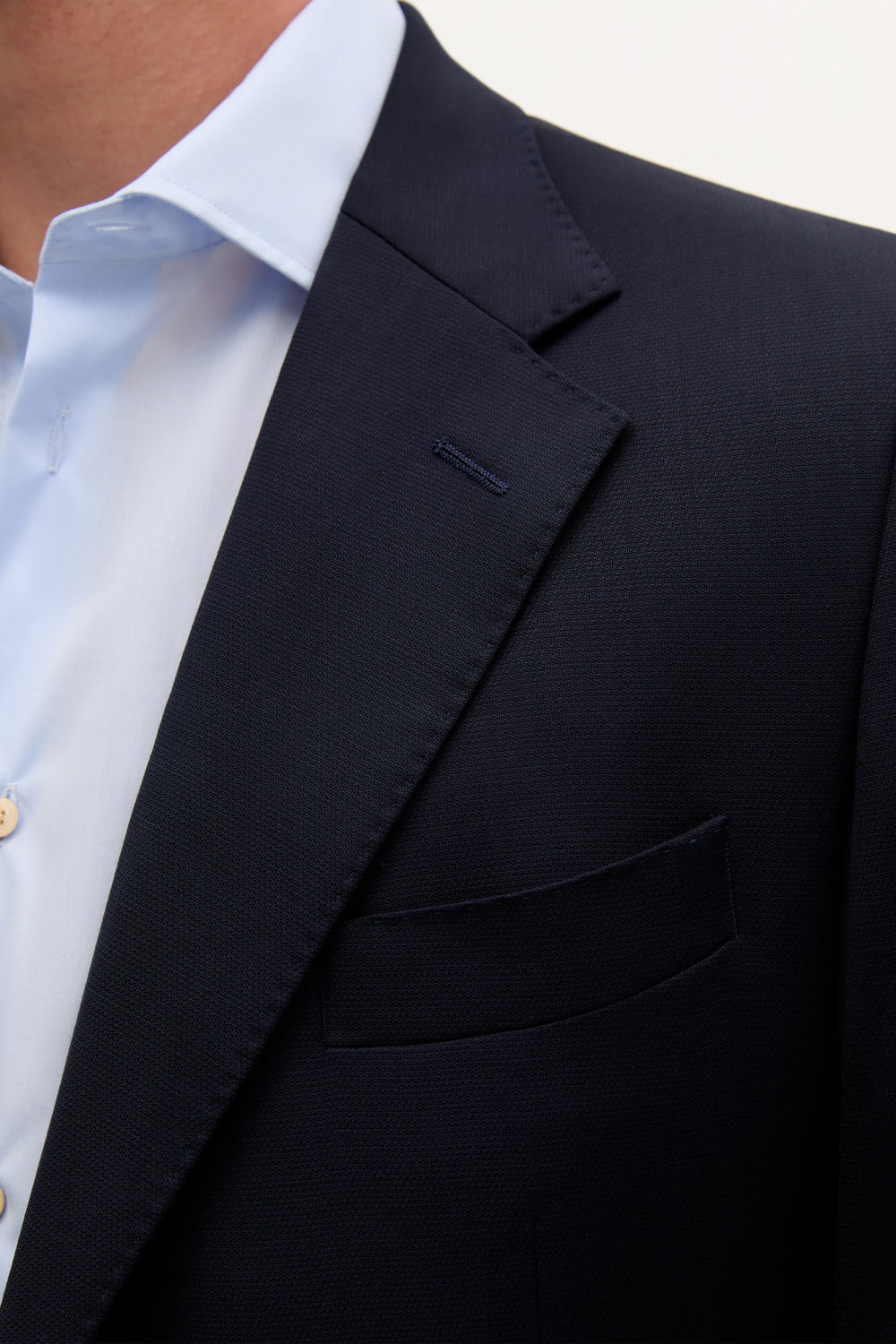 Jacket made of 100% wool. Single button fastening. Notched lapels. Chest welt pocket, side flap pockets. Back vent.