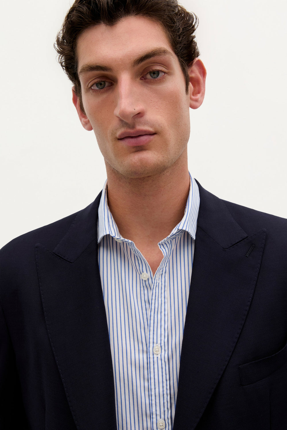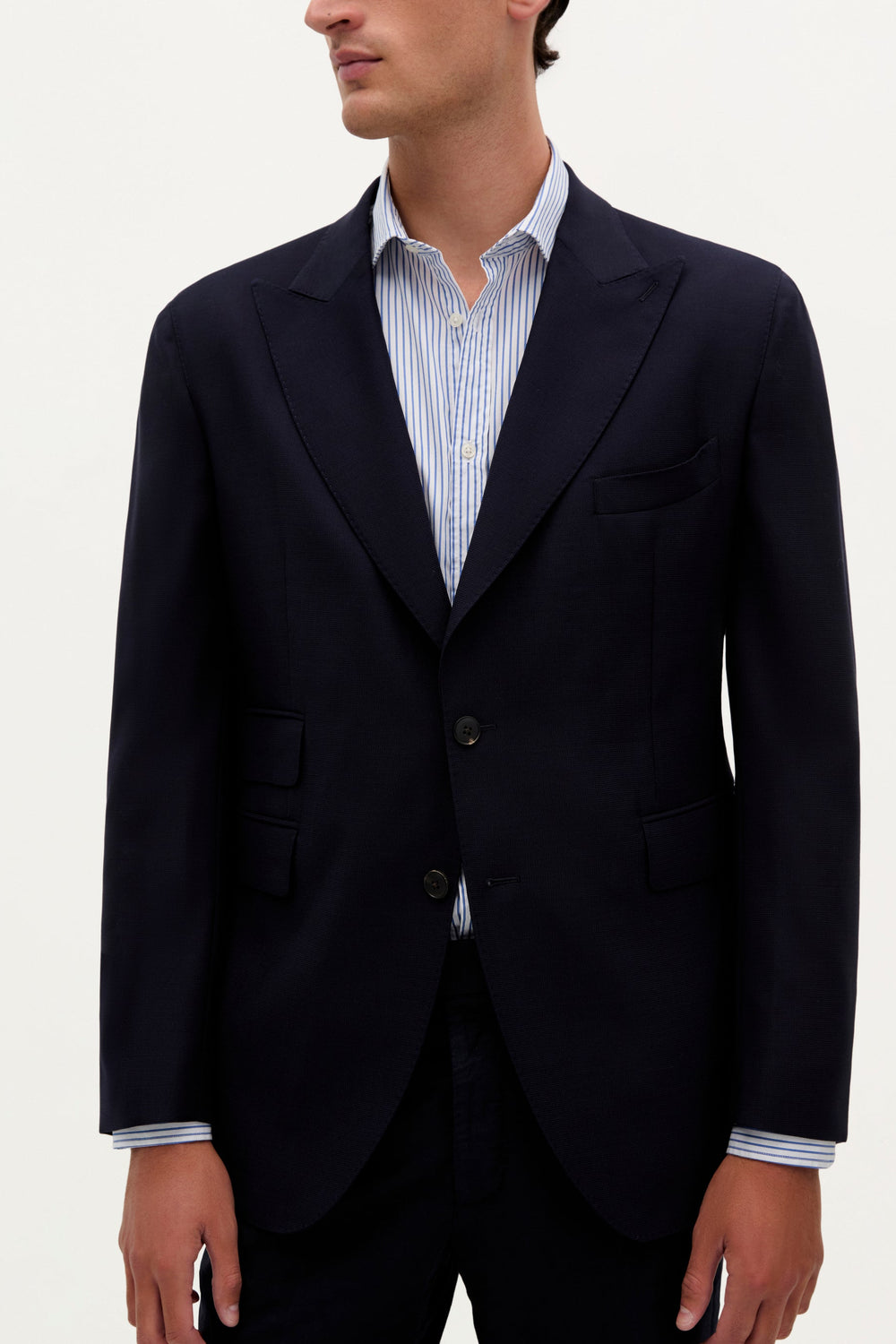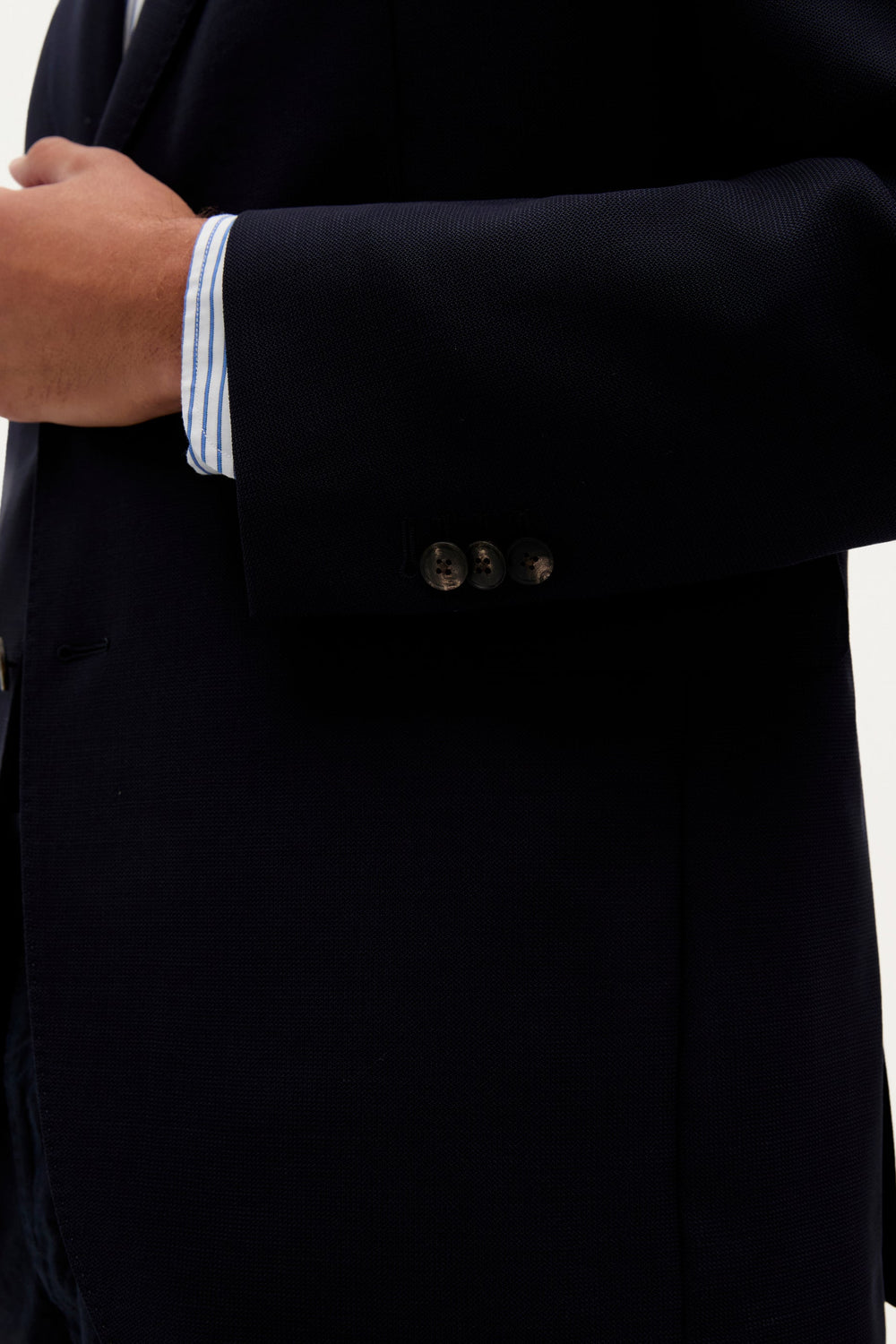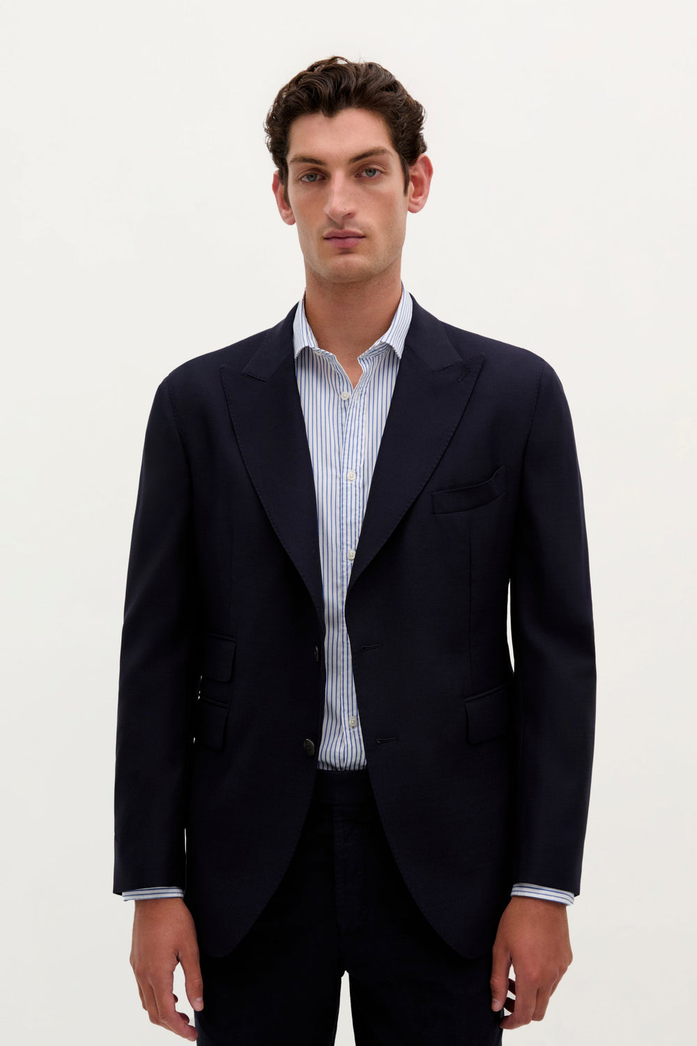 Americana confeccionada en mezcla de lana. Corte Slim Fit, cuello con solapas de muesca y ojal y cierre con dos botones. Manga larga terminada en puño de tres botones y bolsillos delanteros. Aberturas traseras y bolsillos interiores.