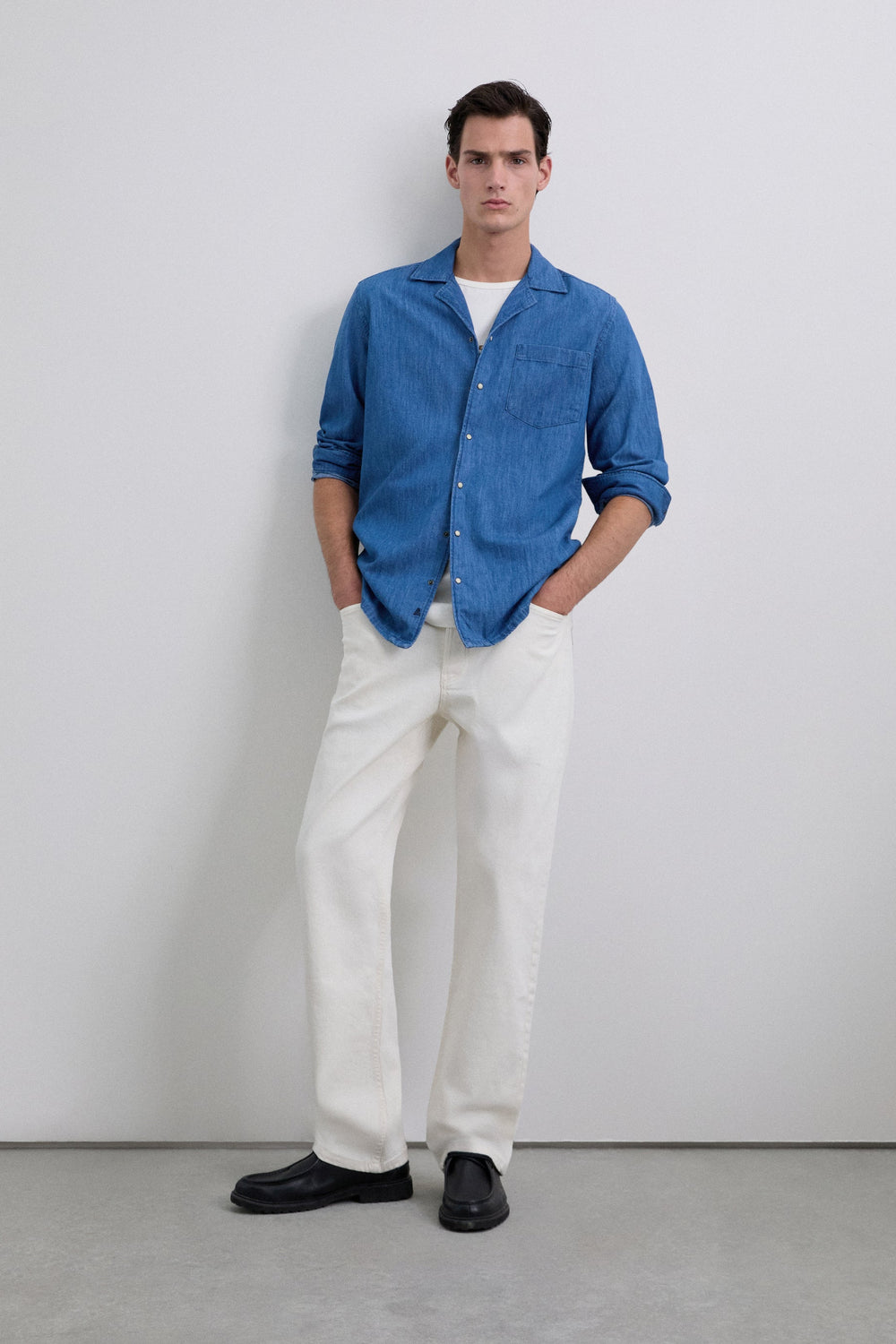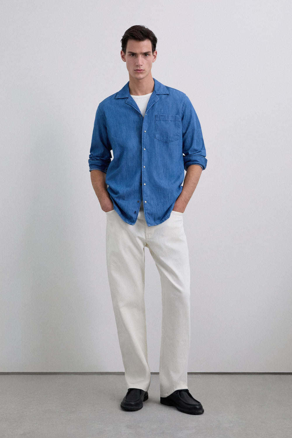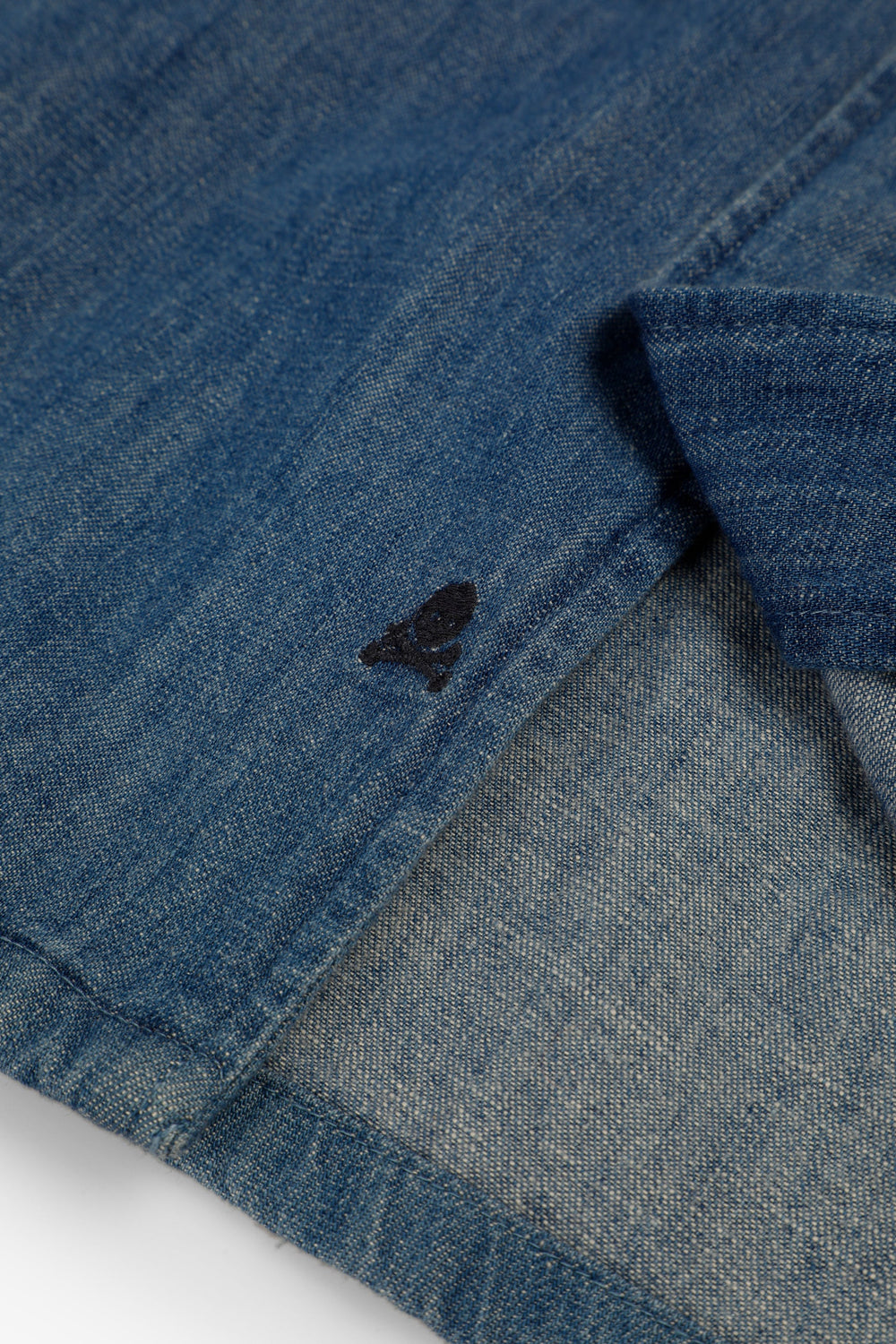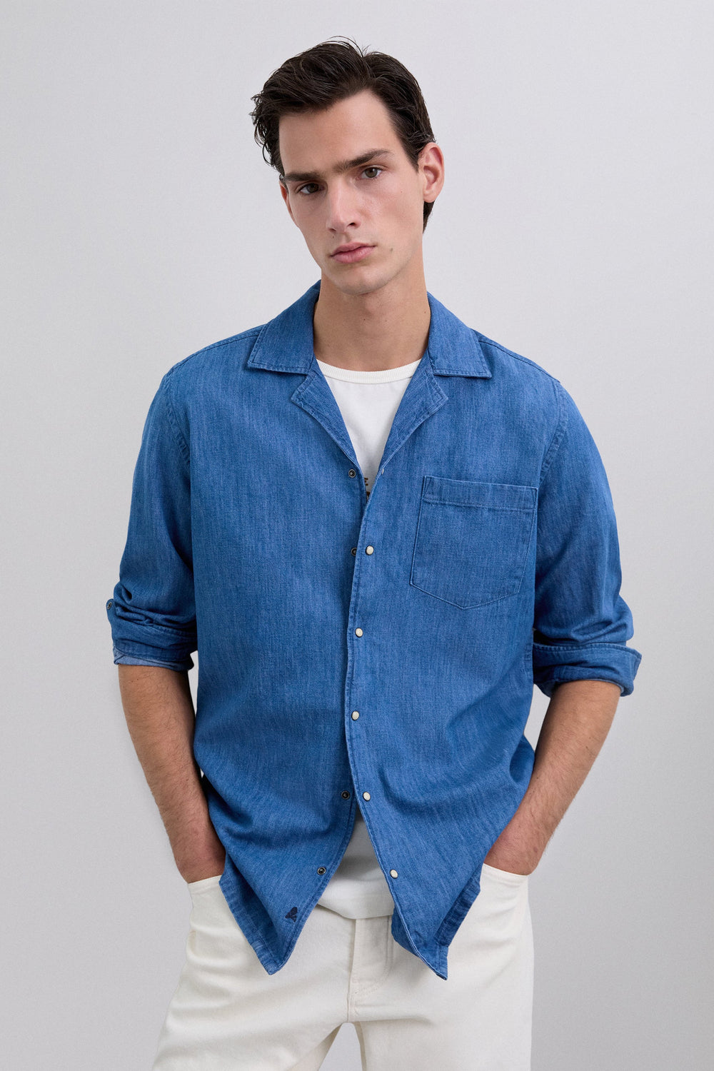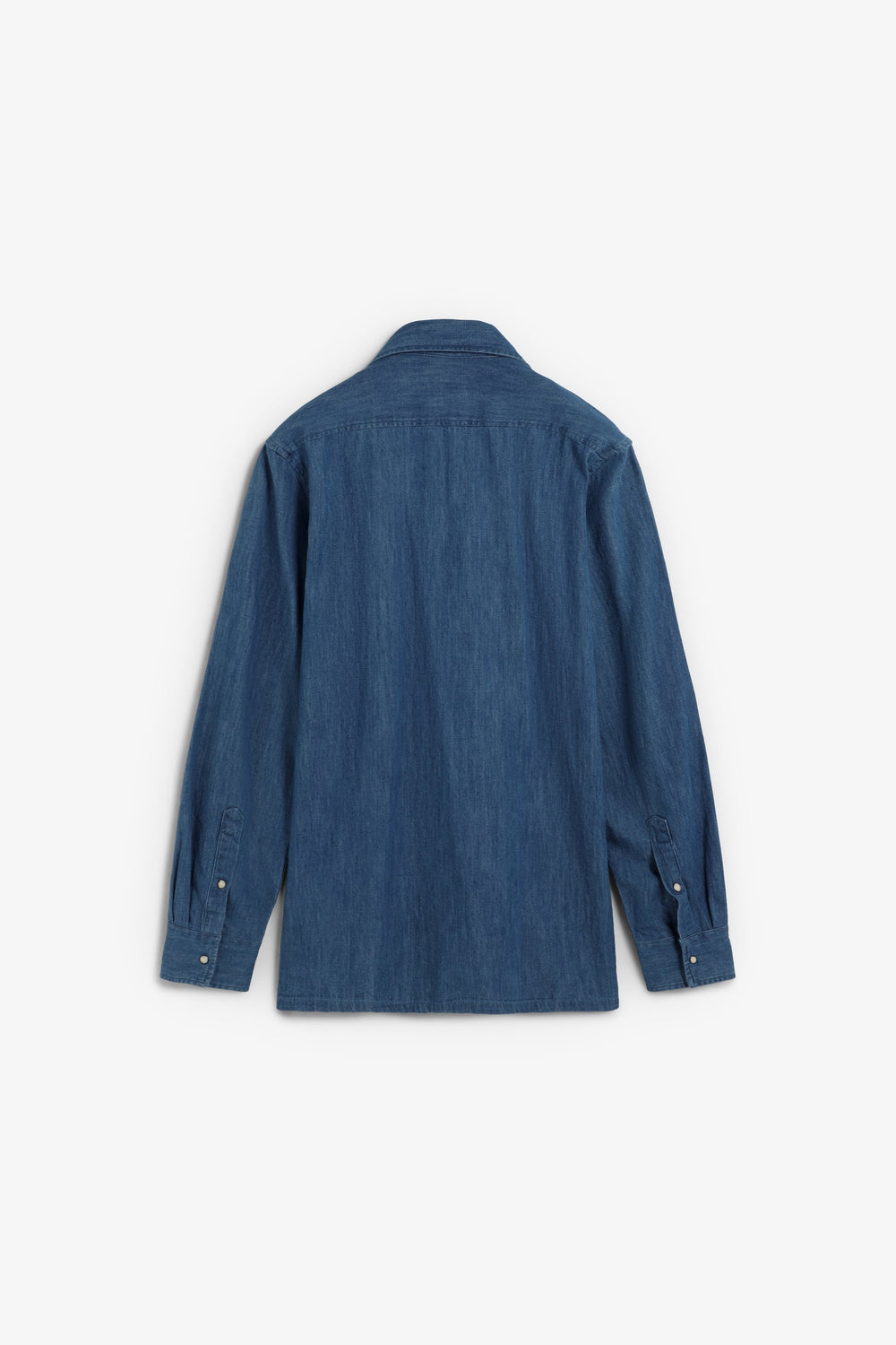 Denim shirt made of 100% BCI cotton. Regular fit. Shirt collar. Button-up front. Long sleeves. Buttoned cuffs. Chest pocket. Embroidered logo detail on the placket.