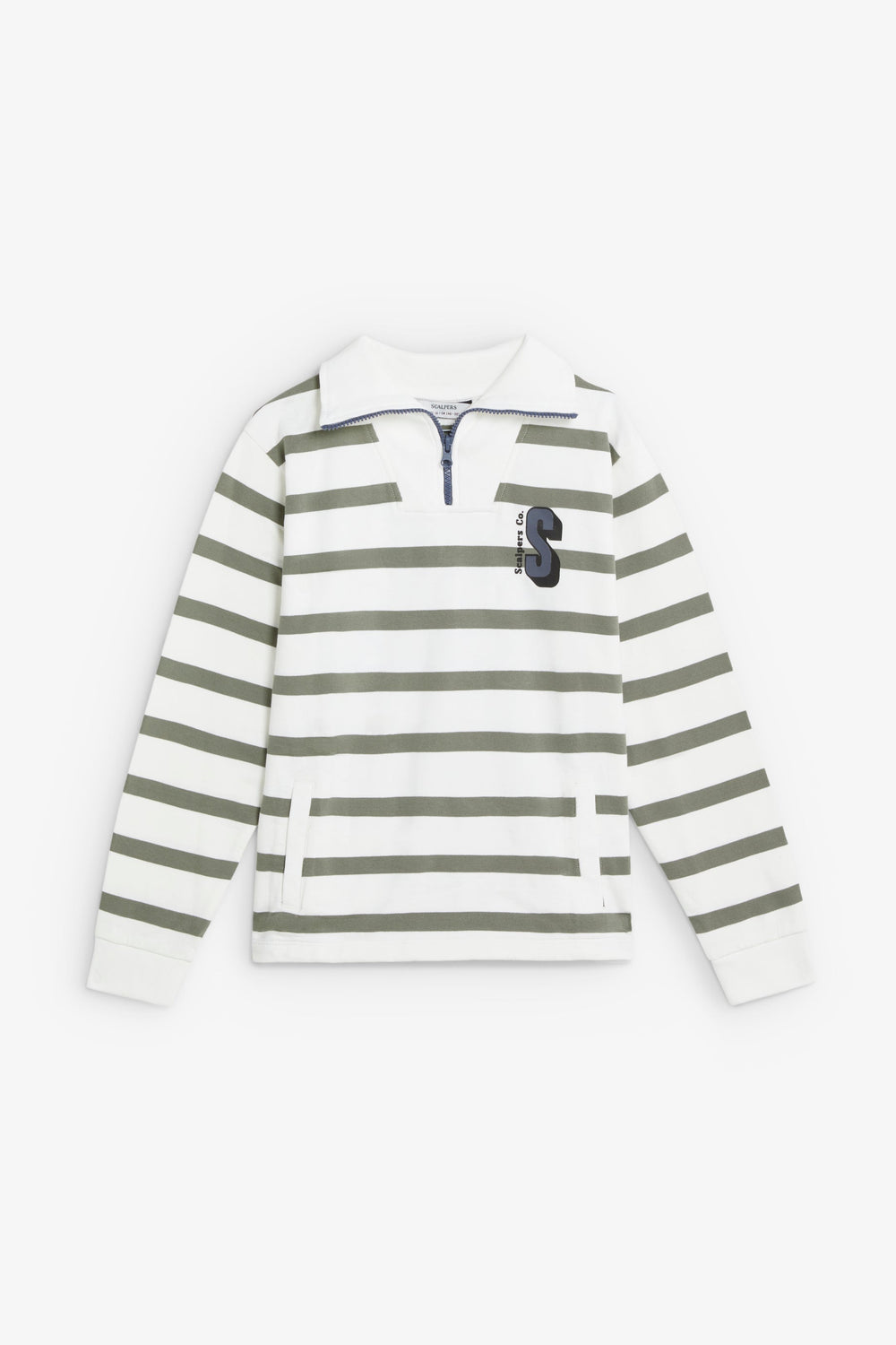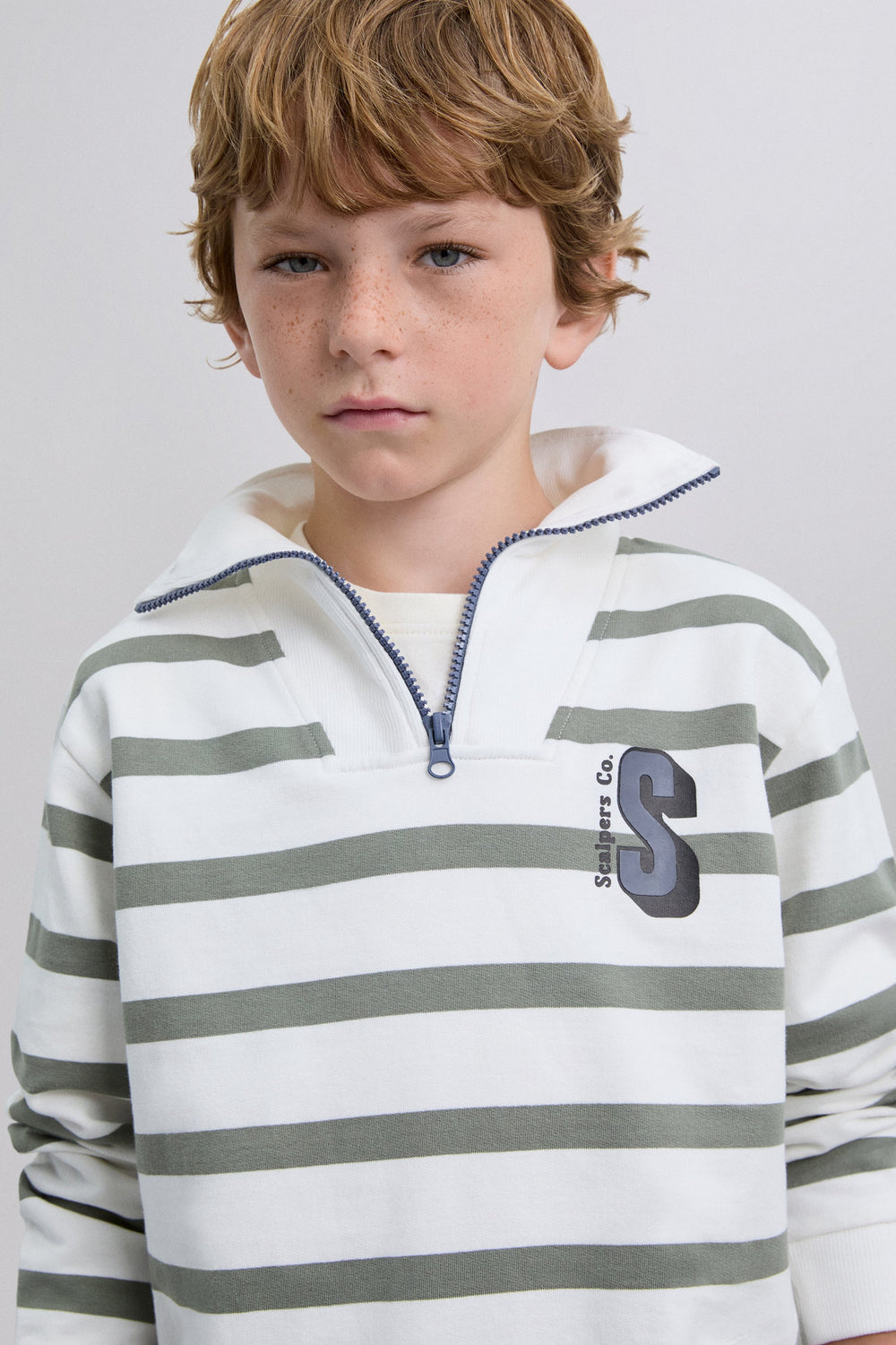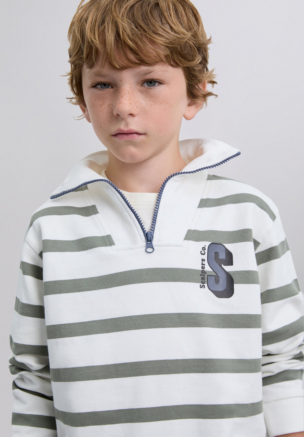 Striped print sweatshirt made of 100% BCI cotton. Collar with half zip fastening. Regular fit. Long sleeves. Two front pockets. Embroidered motif on chest and skull on back. Ribbed trim.