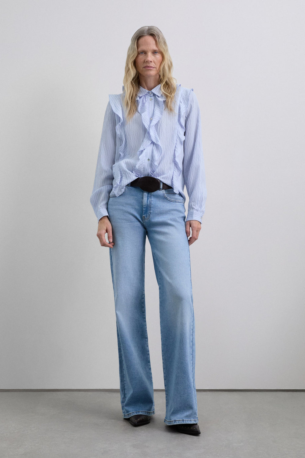 Shirt made of a viscose blend. Striped print with ruffles. Classic collar and long sleeves with buttoned cuffs. Button fastening. Ruffle details.