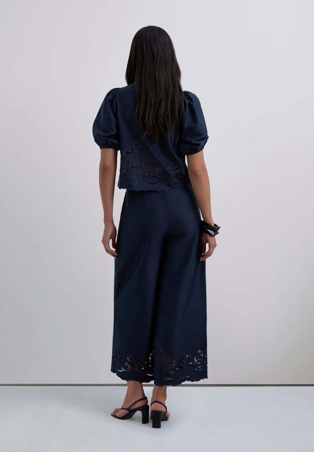 Pantalón largo culotte. Bordado calado en toda la pierna, especialmente alrededor del bajo. Bolsillos frontales inclinados. Acabado ligeramente en vuelo.