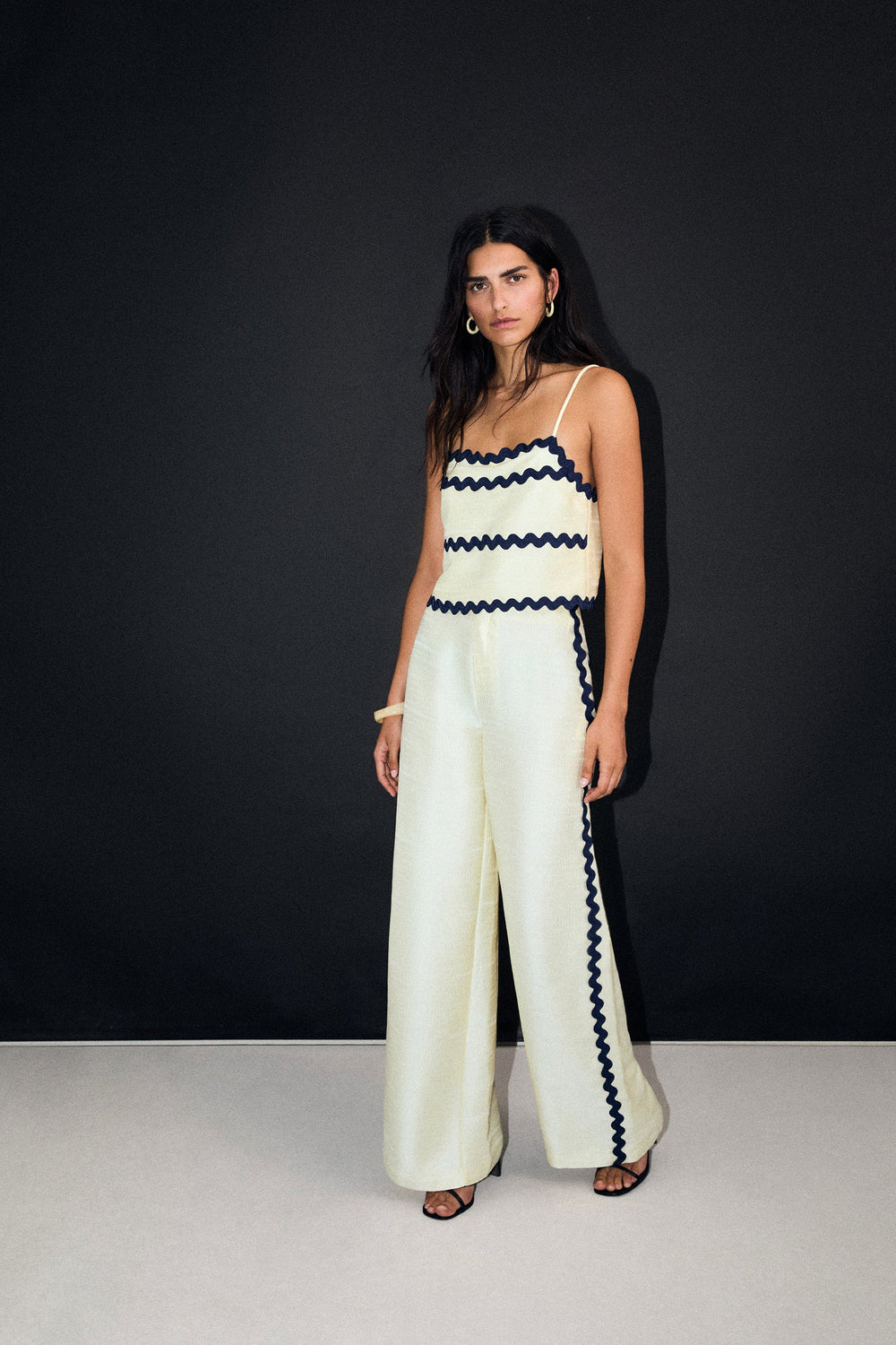 Pantalón full length de tiro alto ligeramente satinado. Motivo de ondas a contraste. Bolsillos traseros de parche. Cierre en frontal mediante corchete y cremallera.
