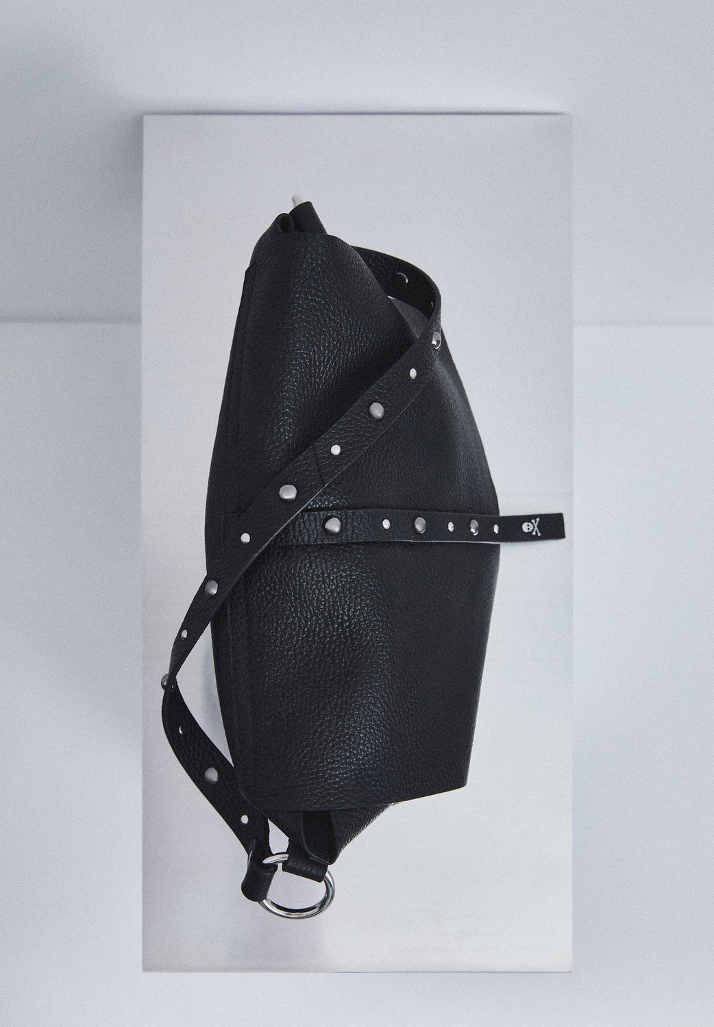 Bag made of 100% leather with stud details. Closing placket. Short handle and long strap.