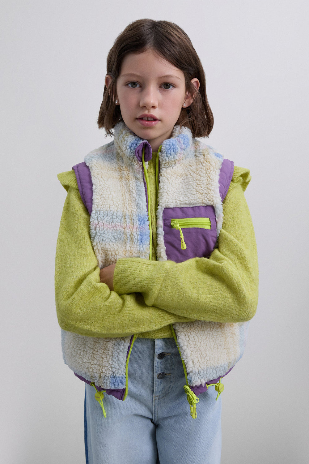 Reflective vest made of synthetic blend fabric. Contrast trim. Zipped chest pocket.