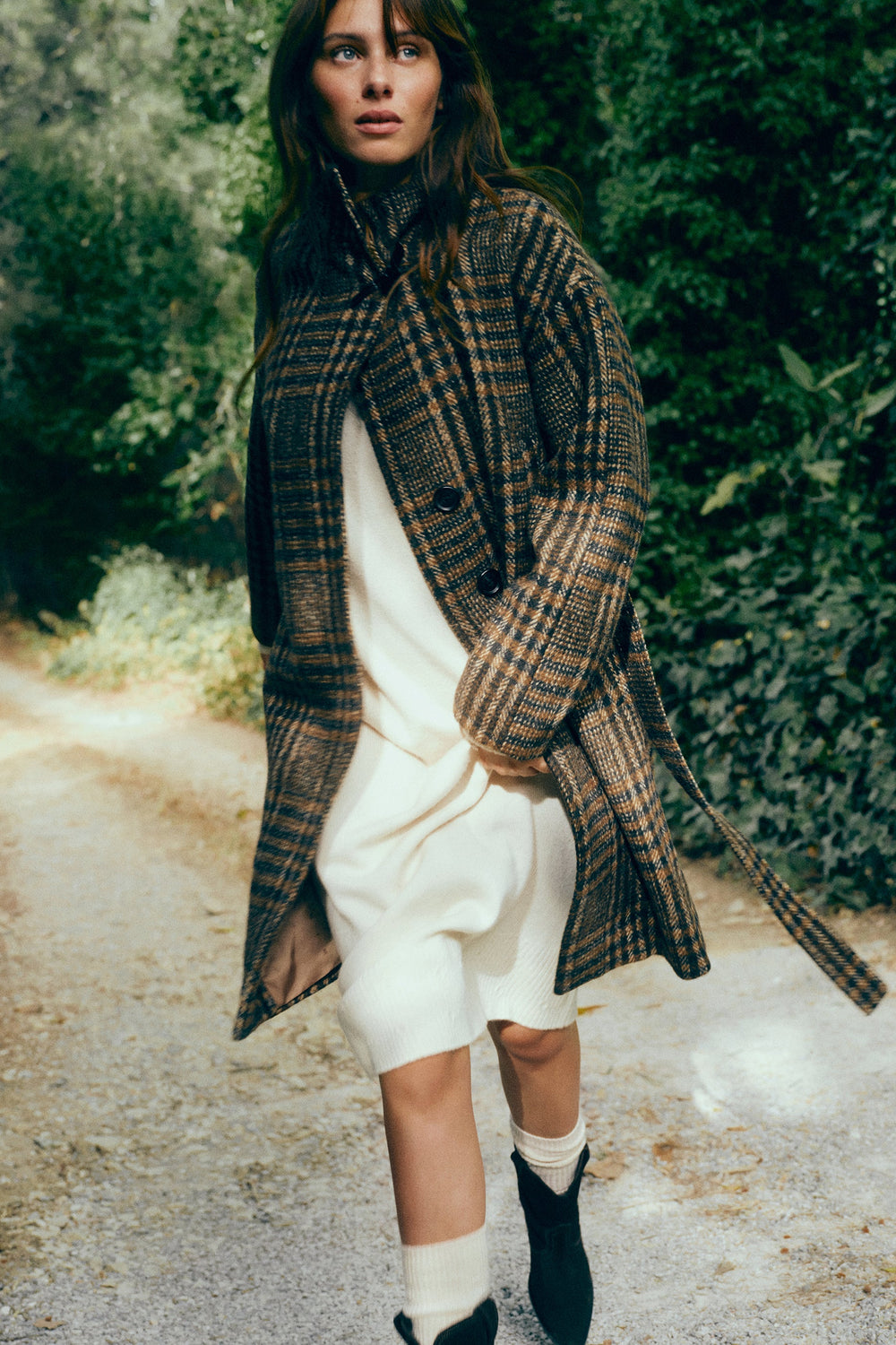 Shirt check print coat made of wool. High collar. Toggle style button at the top. Inner fastening with 2 buttons and outer fastening with adjustable belt. Long sleeves with turn-back cuffs.