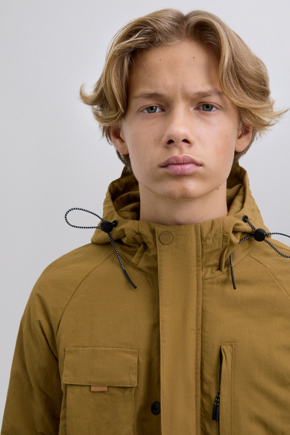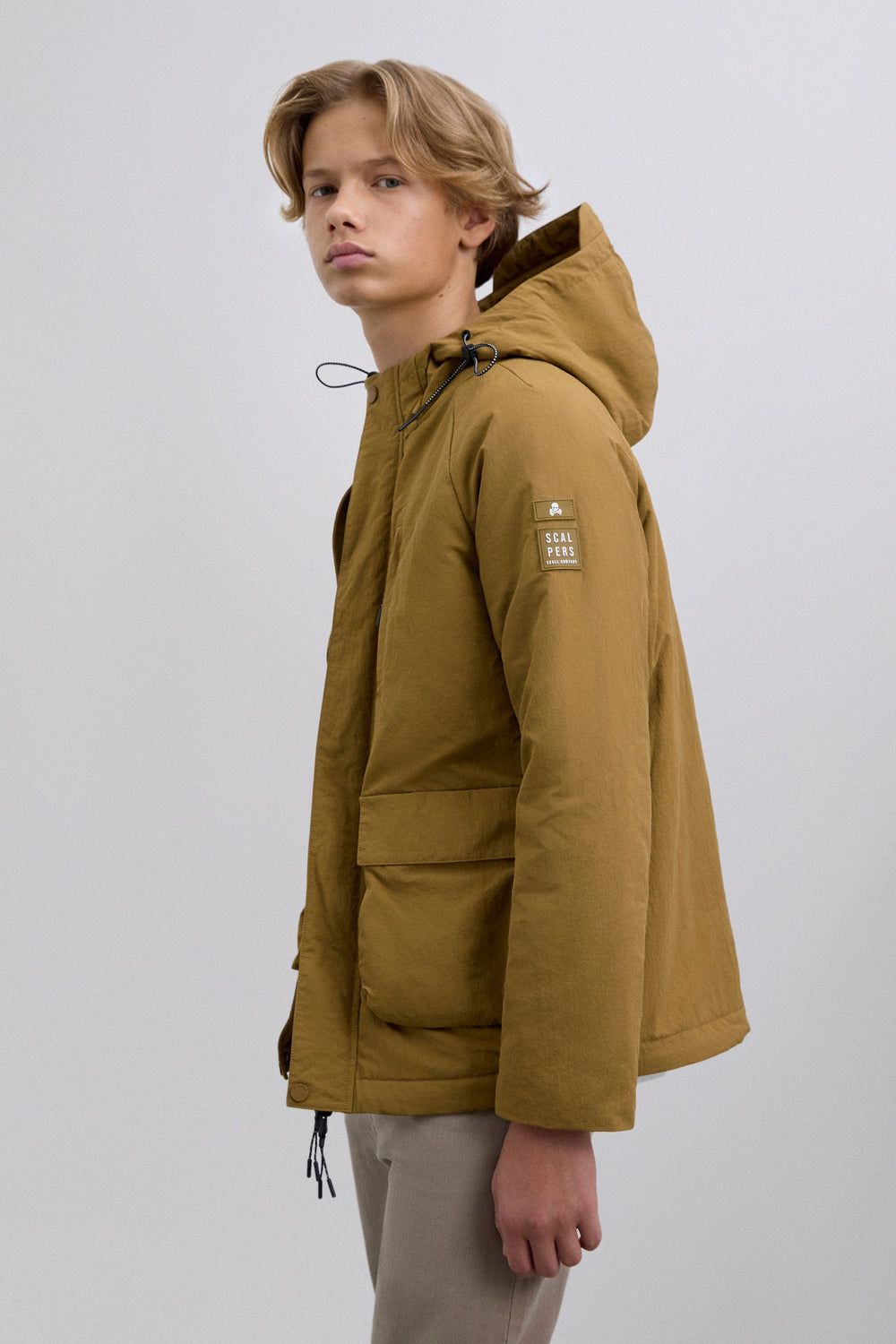 Long sleeve jacket with adjustable drawstring hood. Four front pockets: two on the chest and two lower flap pockets. Front button and zip fastening. Contrast rubber logo patch detail and skull on the sleeve.