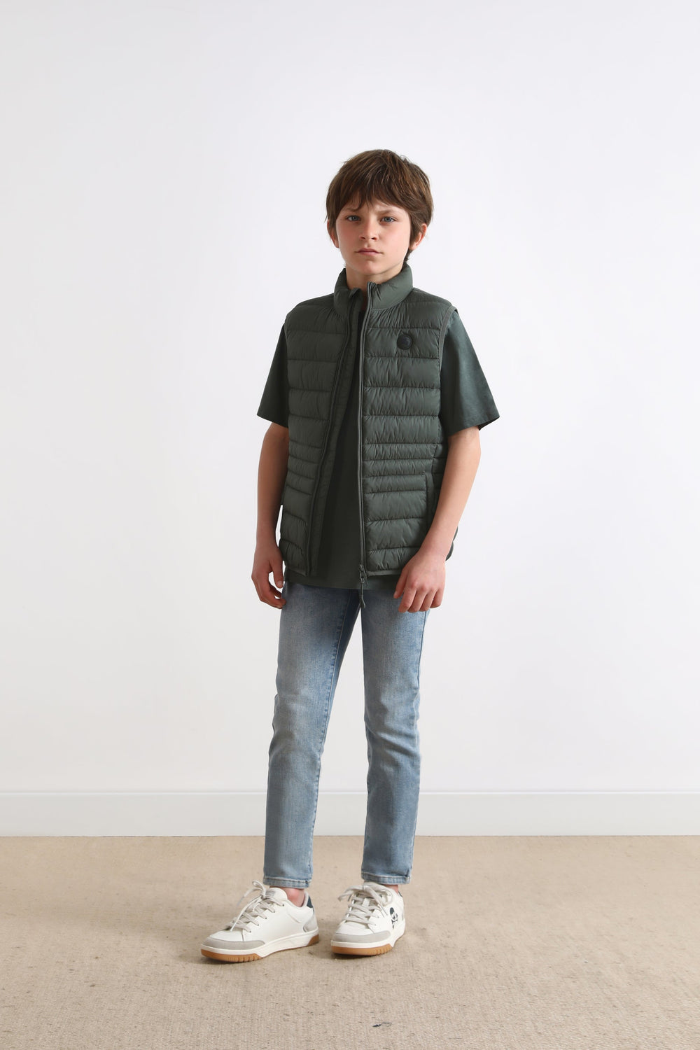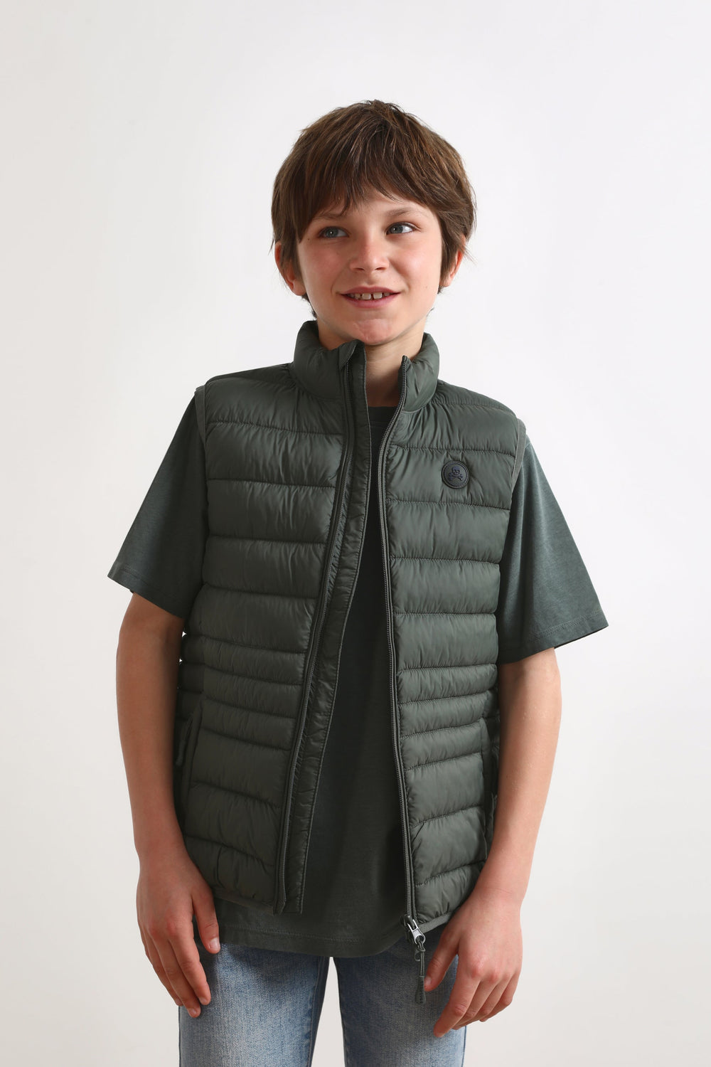 Light puffer gilet. Crafted from nylon and recycled polyester fabric. Slim Fit. High collar. Two-way zip fastening. Zip pockets and an inner pocket. Rubber patch detail on the chest.