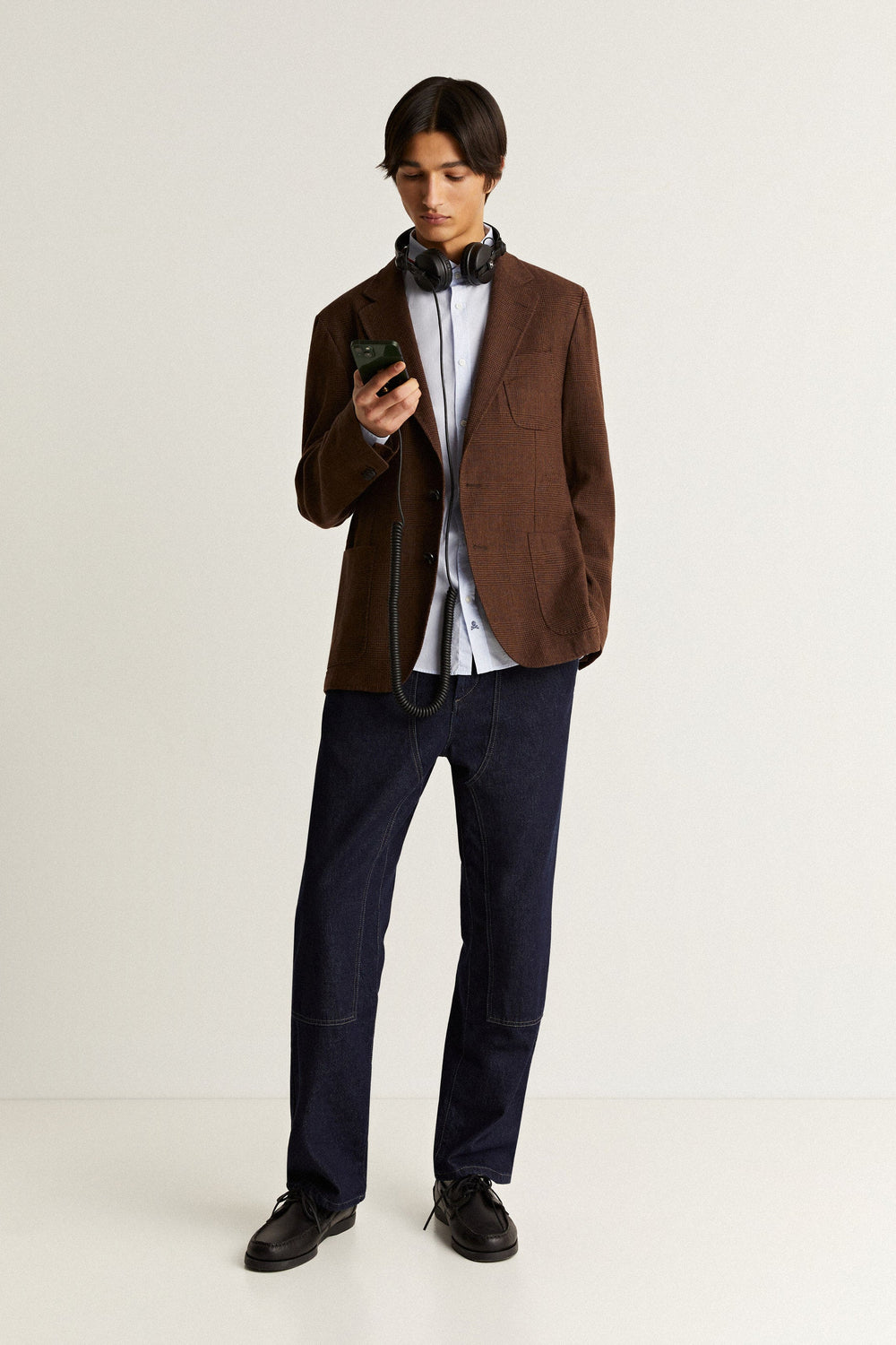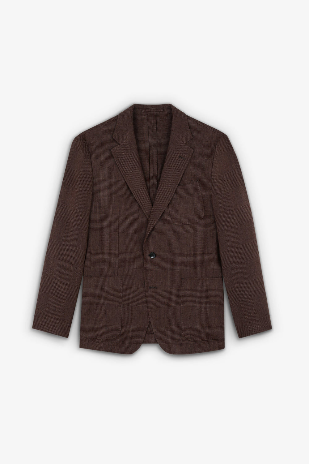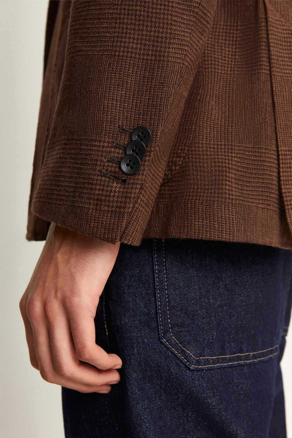 Prince of Wales check blazer. Crafted from a cotton, wool, and linen blend. Regular Fit. Notch lapel collar. Front button fastening. Long sleeves finished with functional buttoned cuffs. Patch pockets. Back side vents.