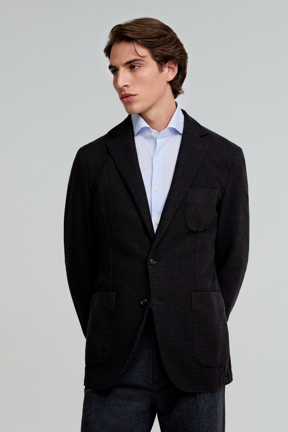 Mini check blazer. Crafted from a Zanieri wool blend. Semi-structured, unlined Regular Fit. Notch lapel collar. Button fastening. Long sleeves finished with functional buttoned cuffs and one closed button. Patch pockets.