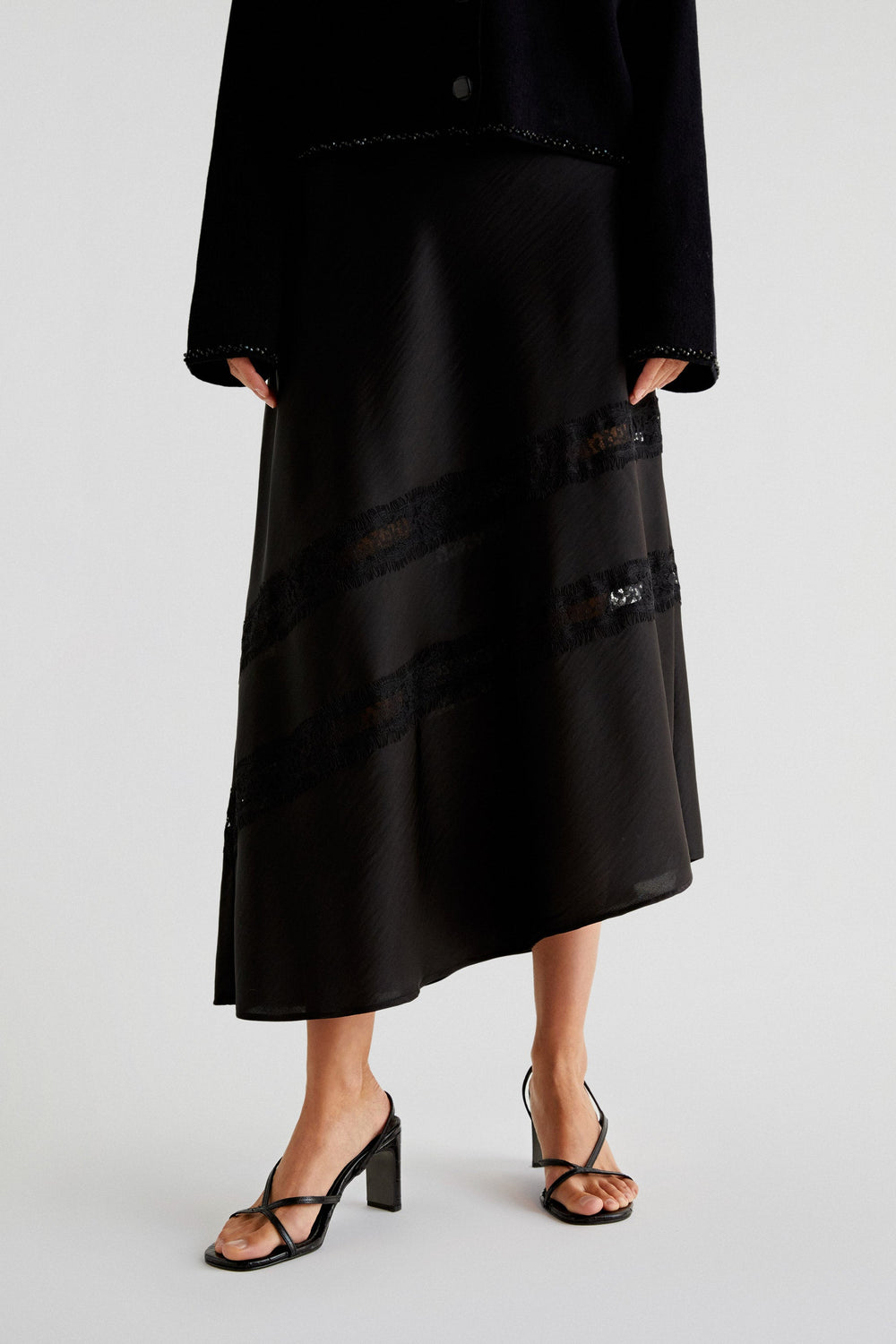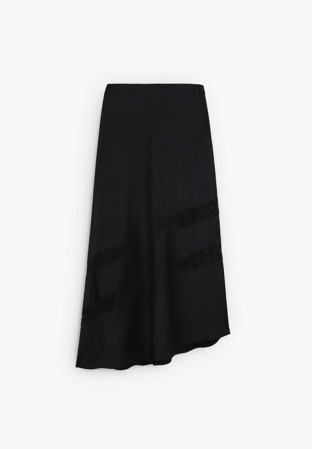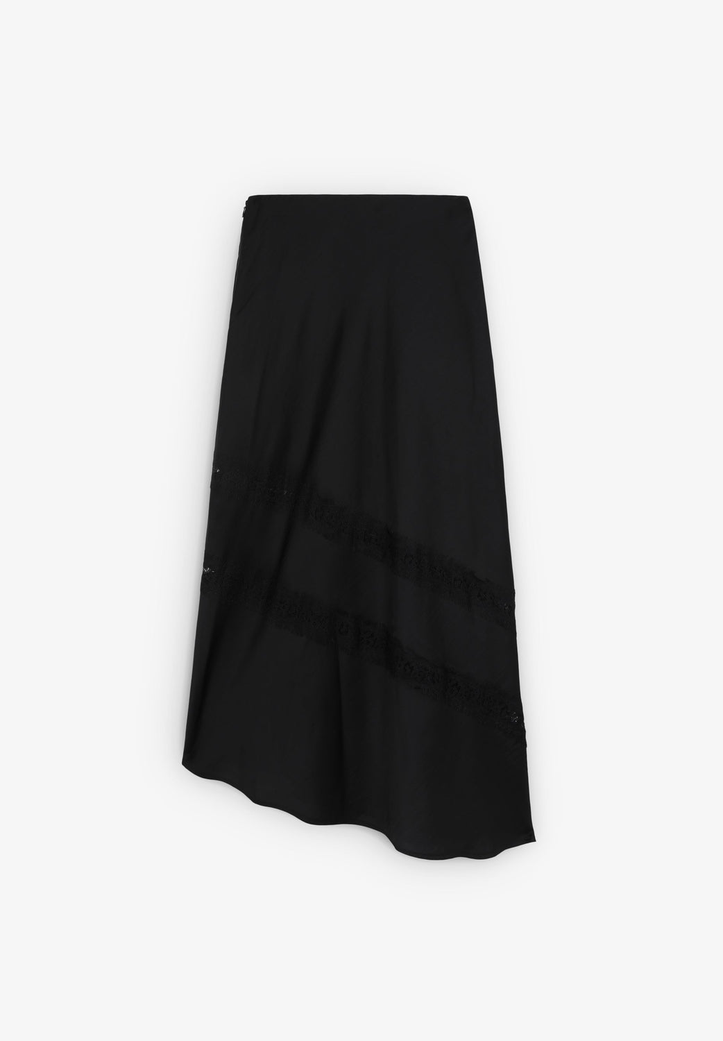 Jupe midi en tissu satiné. Coupe droite et fermeture éclair. Asymétrique et dentelle fantaisie.
