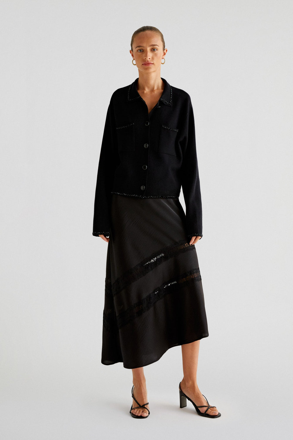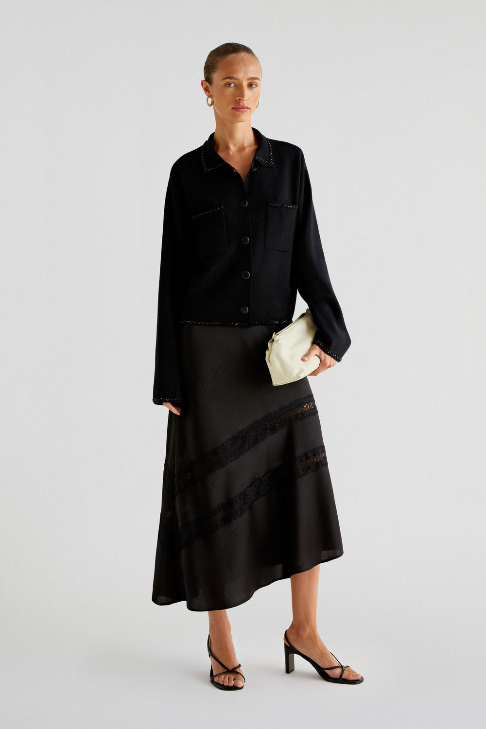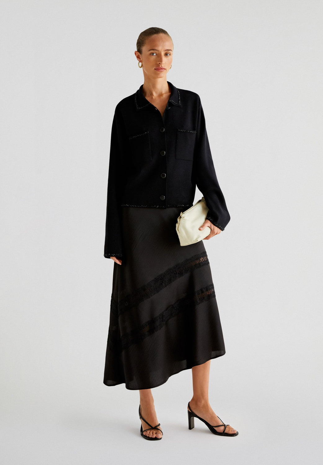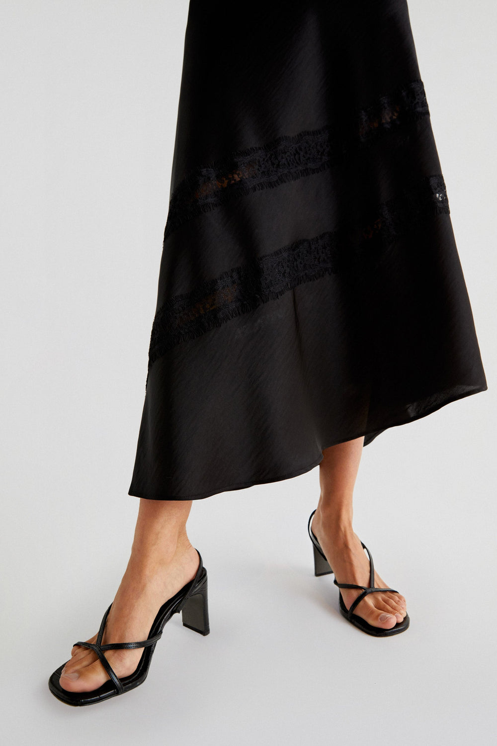 Jupe midi en tissu satiné. Coupe droite et fermeture éclair. Asymétrique et dentelle fantaisie.