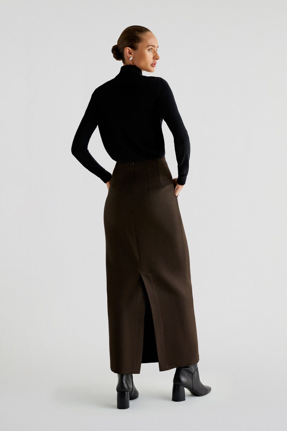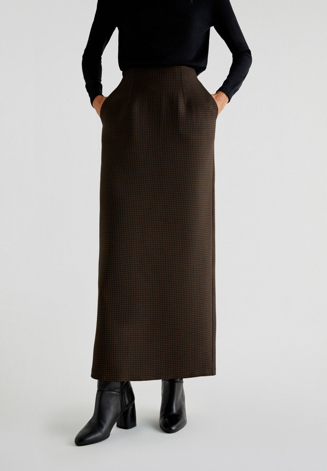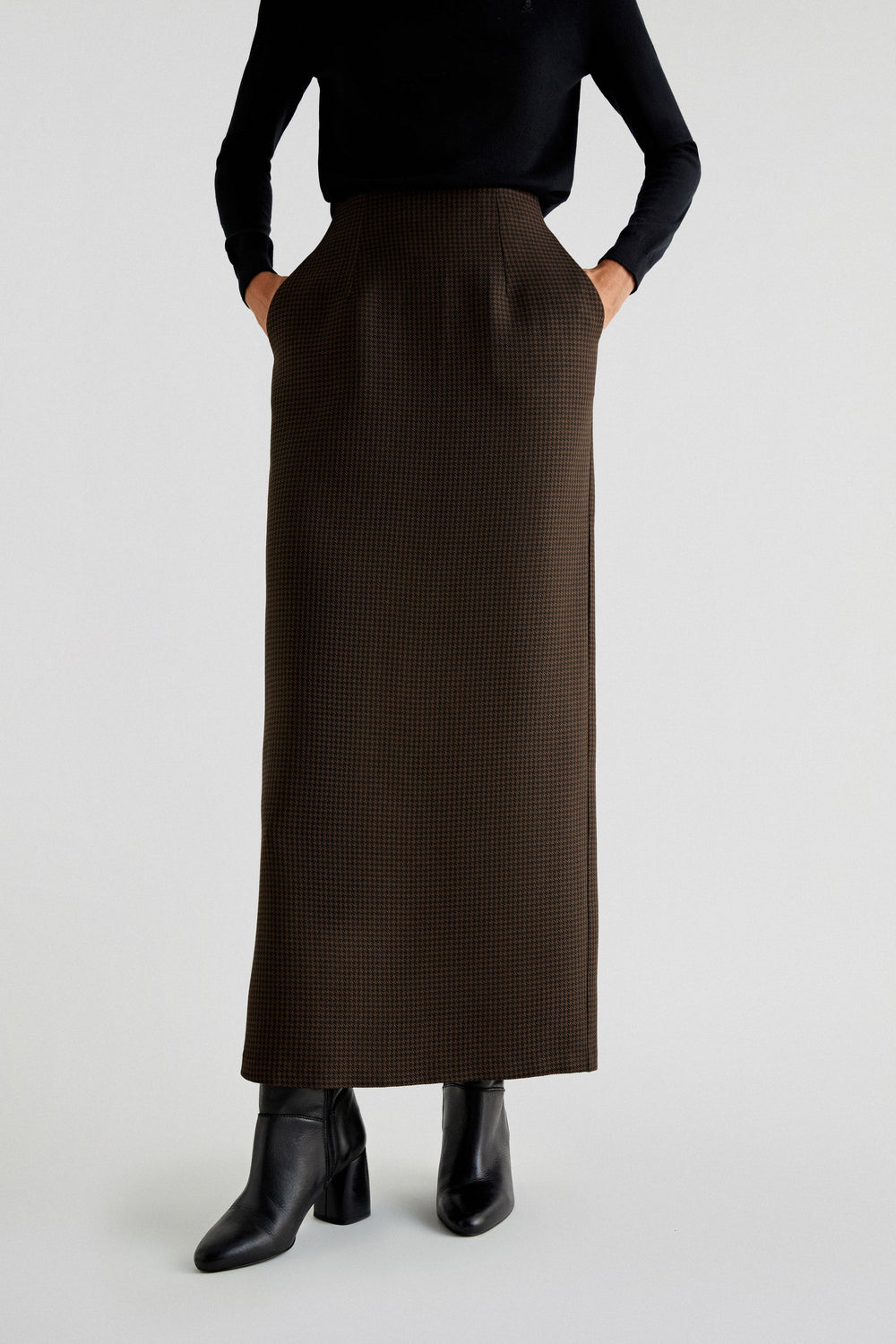 Jupe droite confectionnée en tissu pied-de-poule. Coupe slim avec pinces à l’avant, fermeture Éclair à l’arrière et poches sur les côtés. Ouverture dans le dos au niveau de l’ourlet.