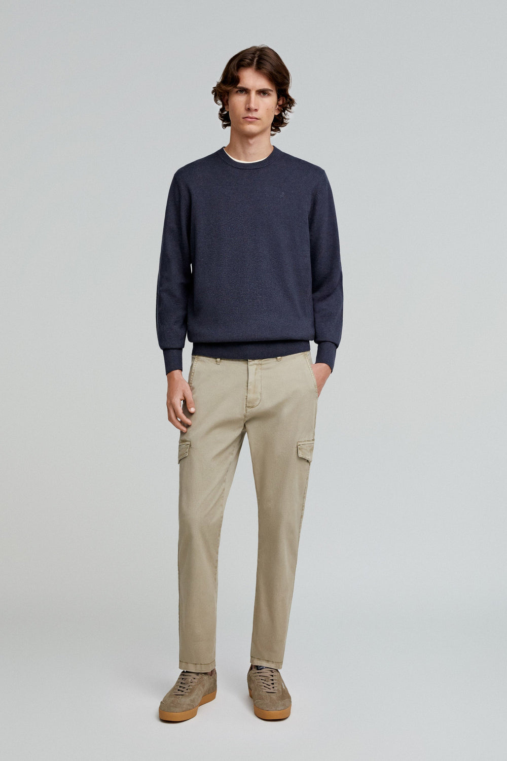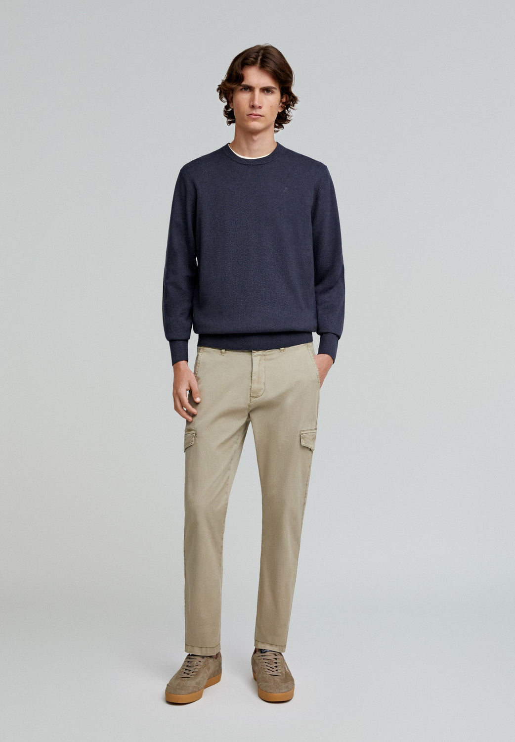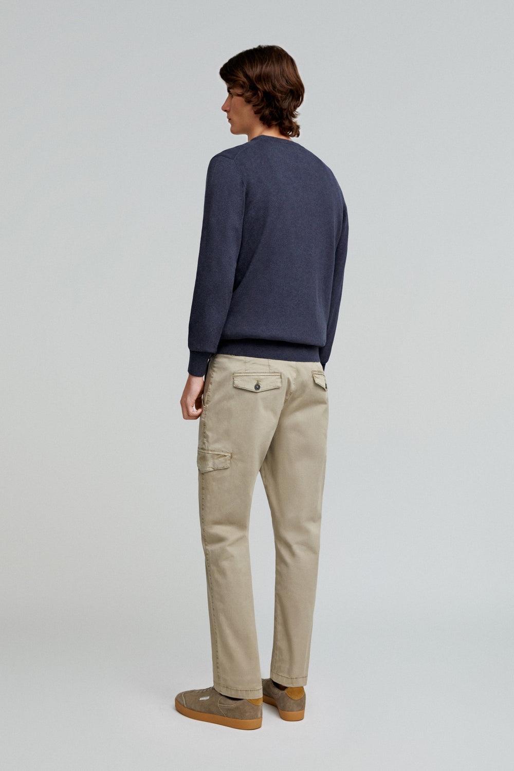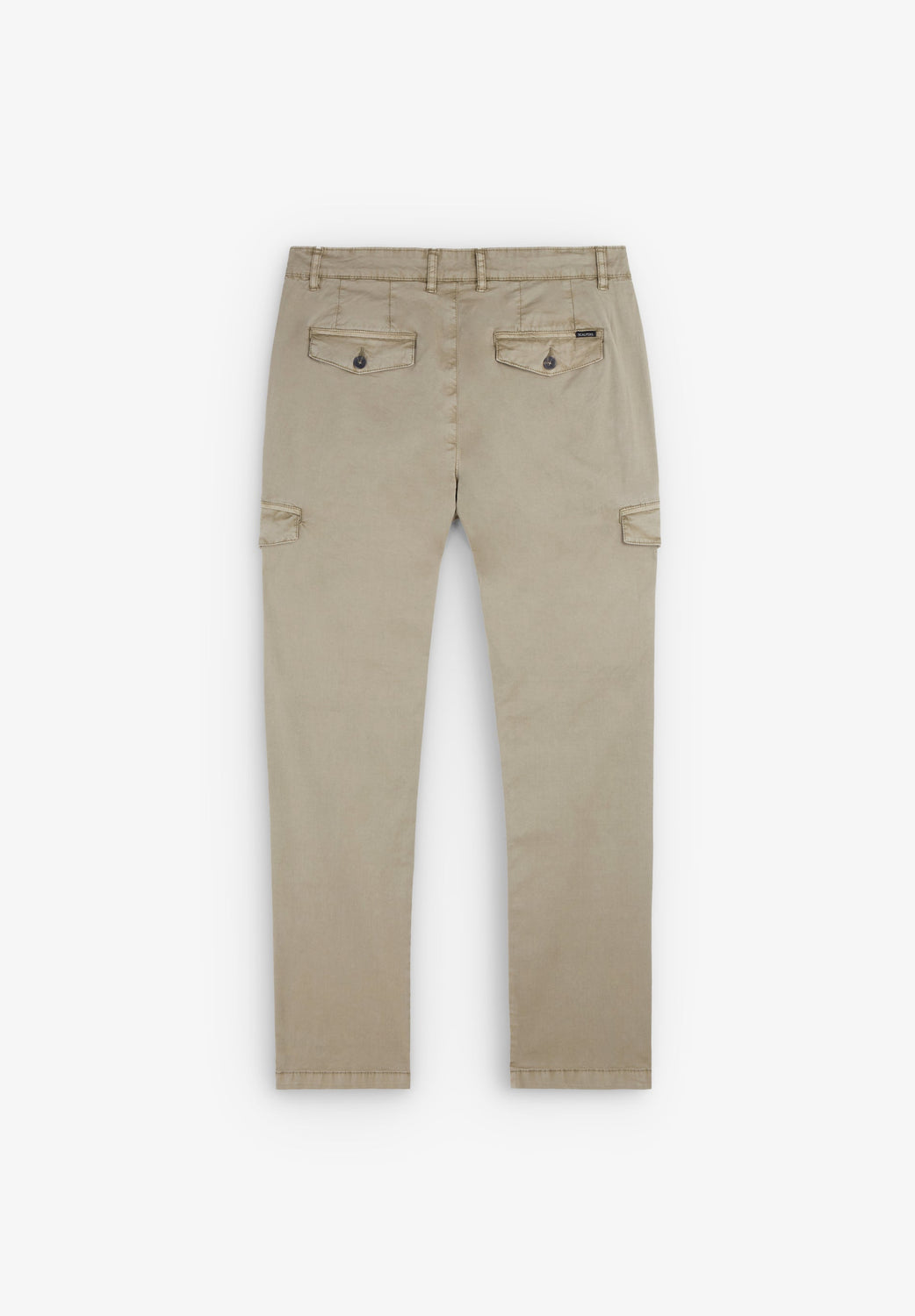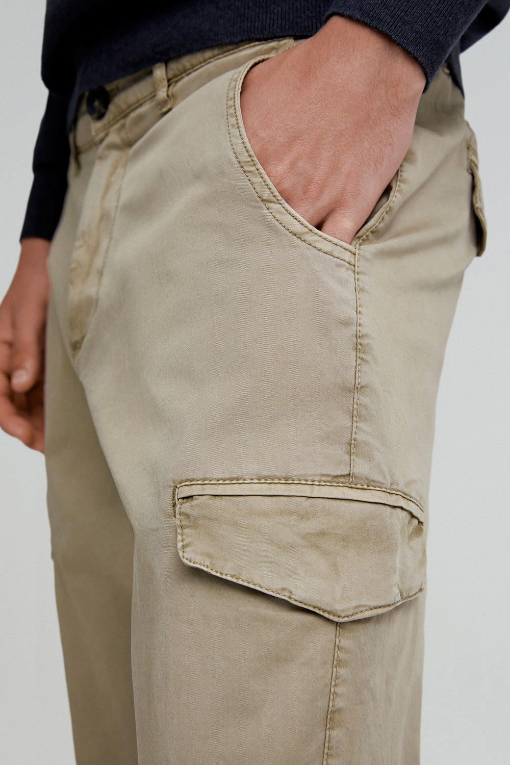 Cargo trousers made of slightly stretch cotton fabric. Regular fit, zip and button fastening. Belt loops at the waist. Leg pockets.