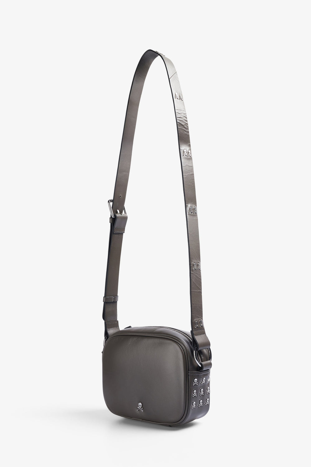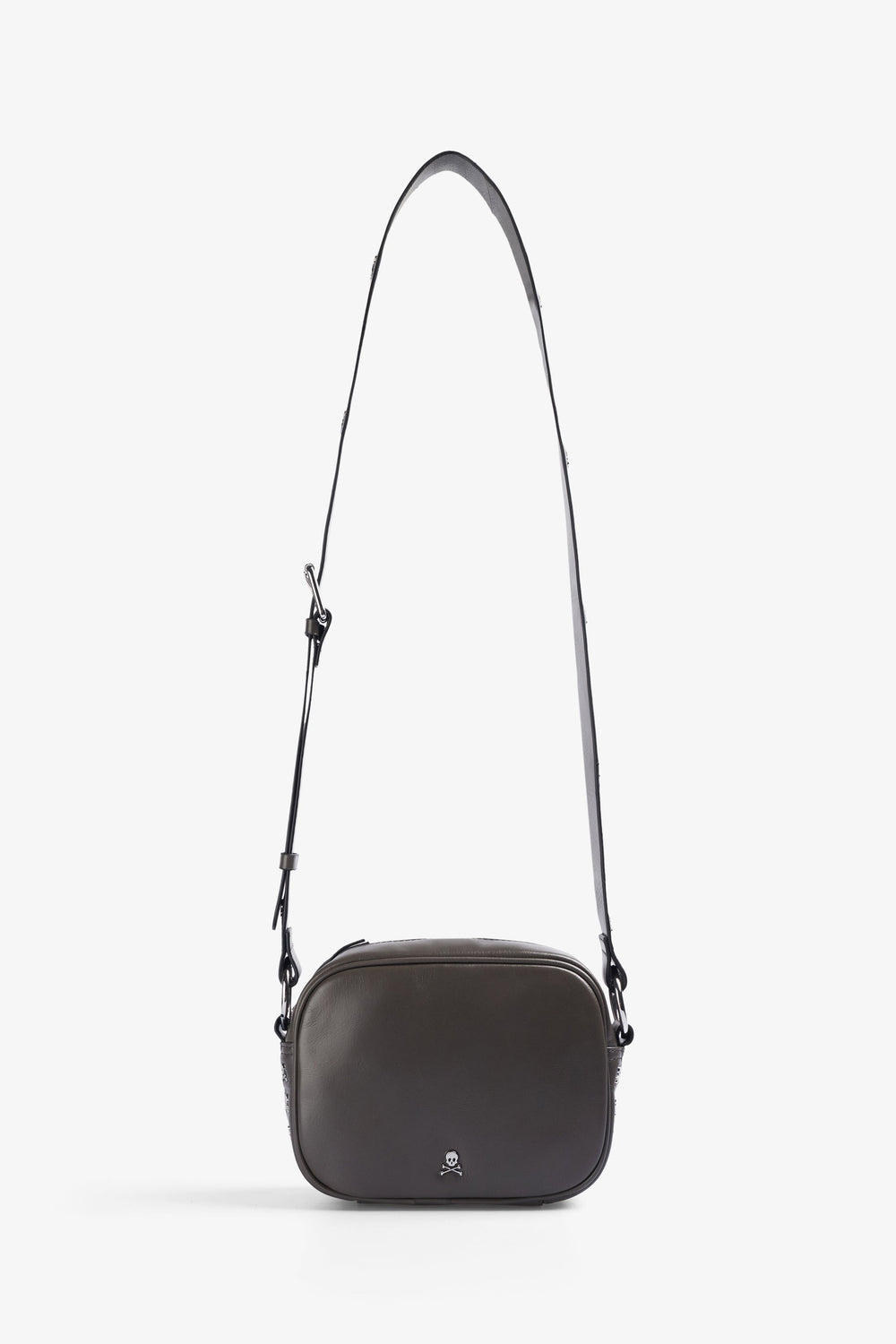 Crossbody bag made of 100% leather. Zip fastening and a long adjustable strap with metallic skulls. Metal logo detail.