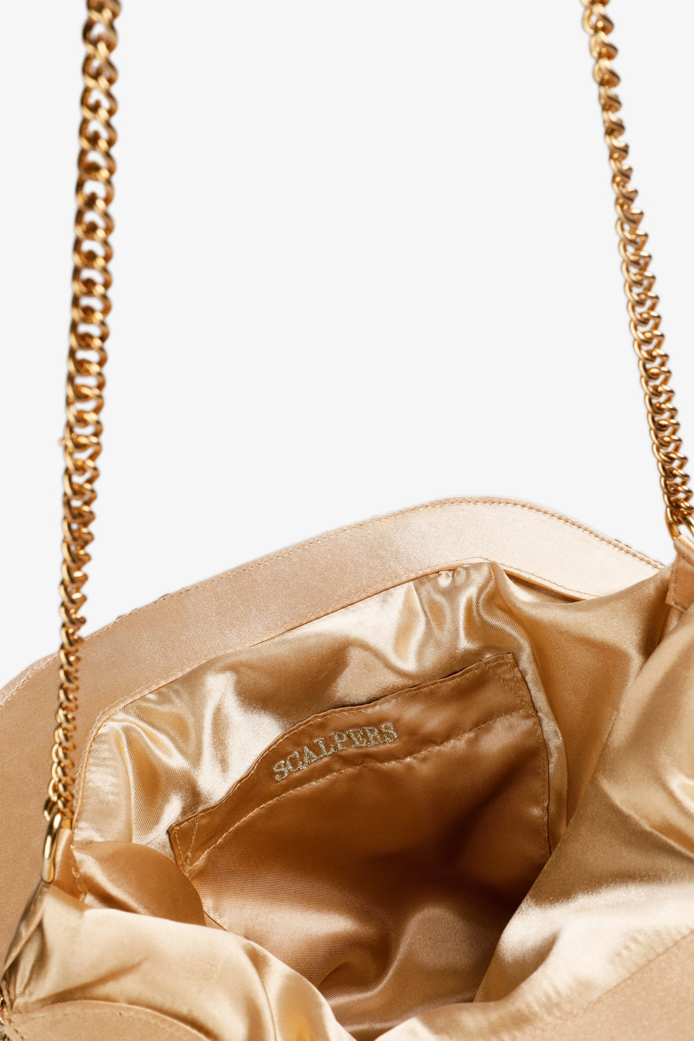 Handbag made of 100% metallic thread with 100% cotton lining. Contrast logo detail on the lining. Inner pocket and magnetic button closure.