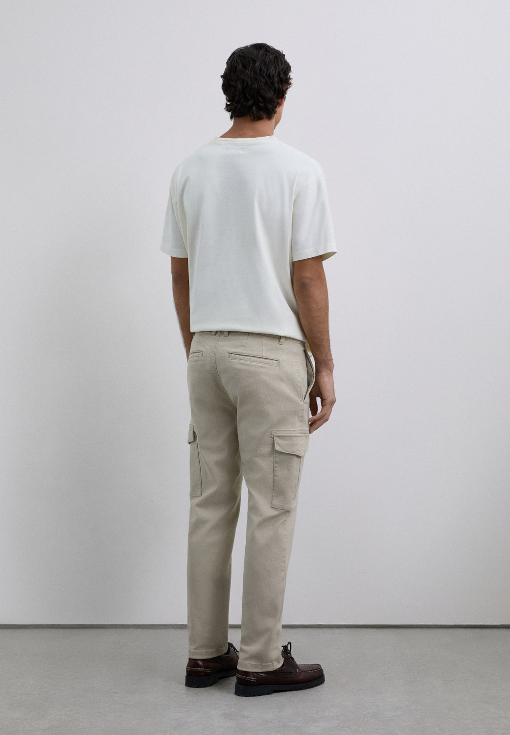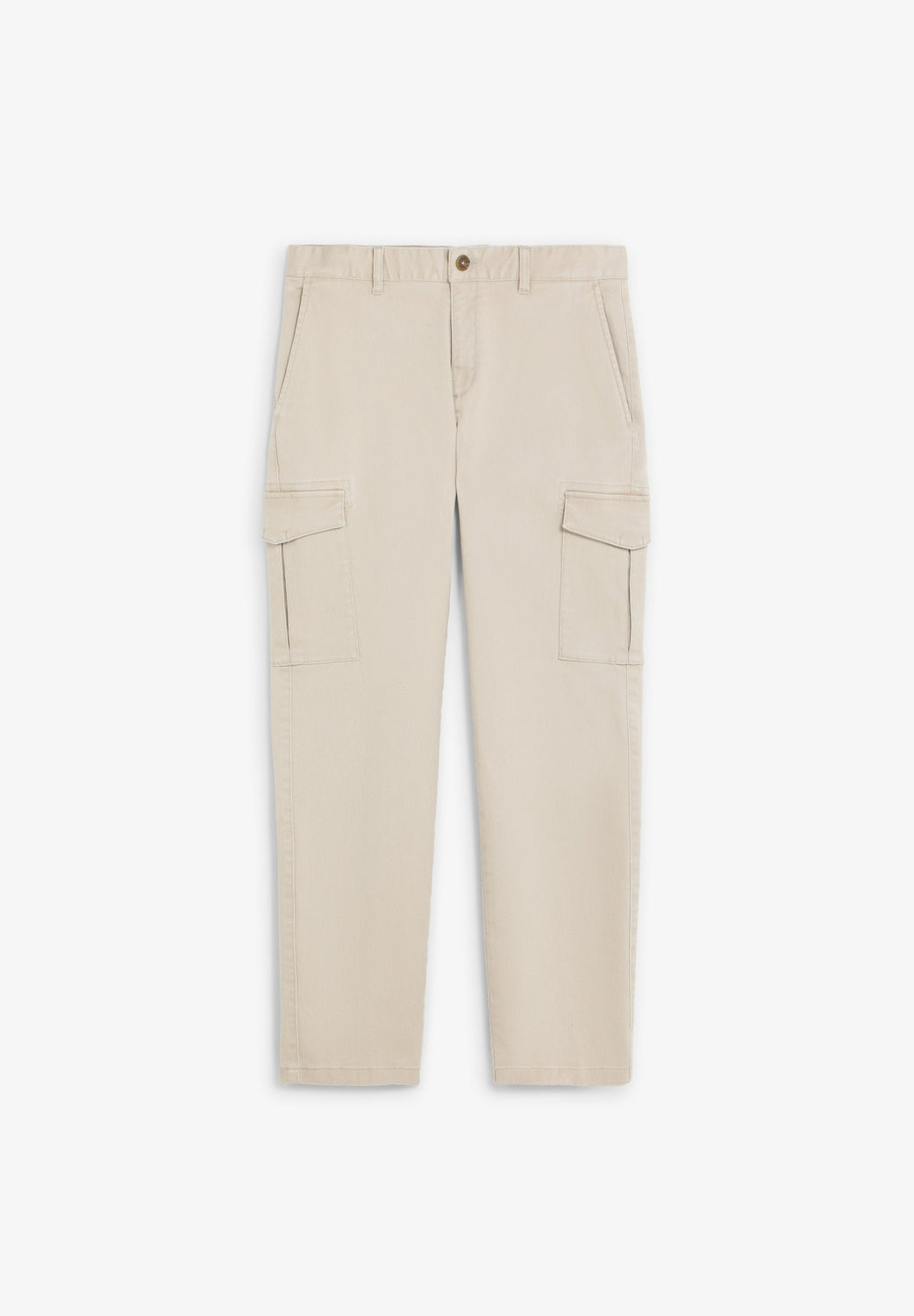 Cargo trousers made of stretch cotton fabric. Cropped fit. Front pockets and back pockets with piped seam detail. Patch pockets with flaps on leg cuffs. Front zip and button fastening.
