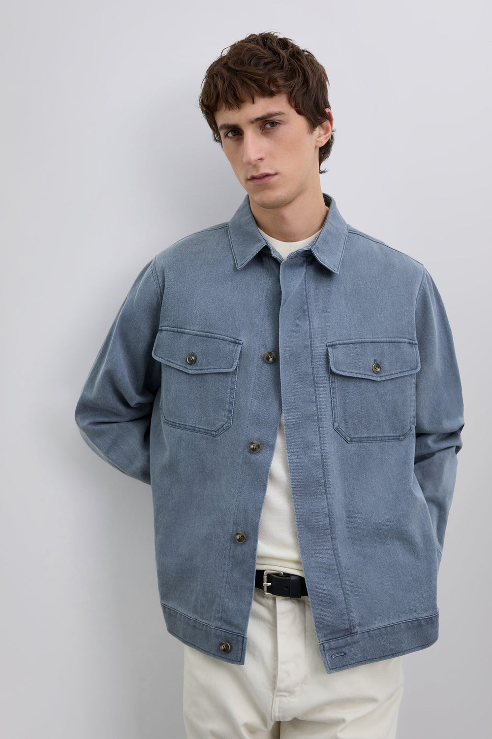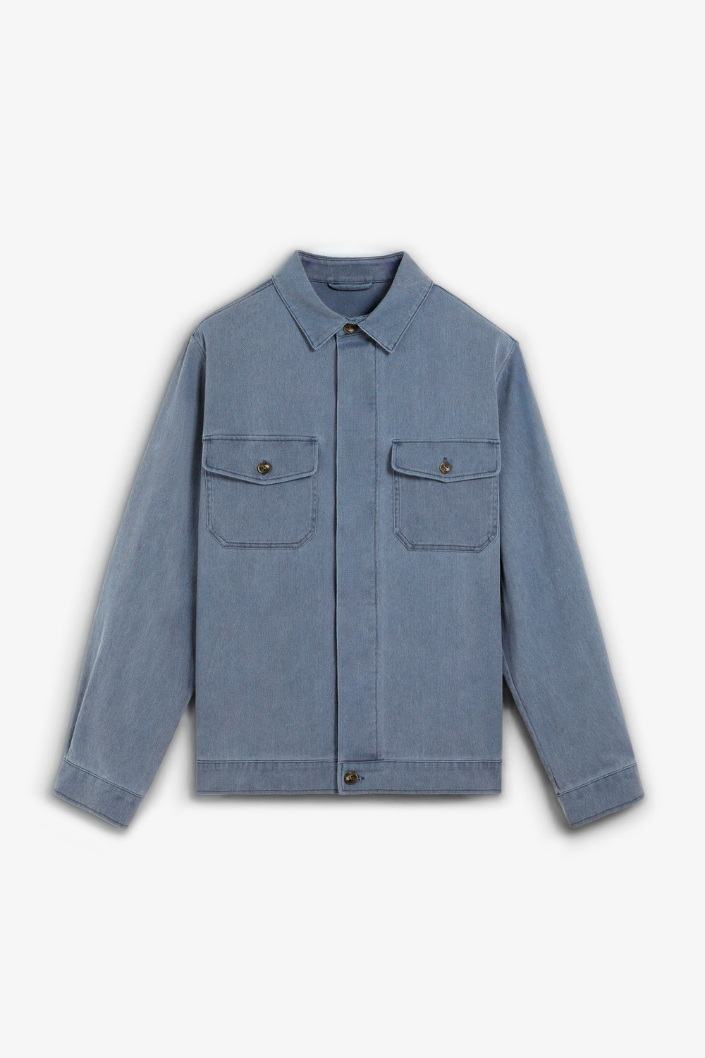 Jacket made of recycled cotton. Faded effect. Two flap pockets on the chest with button fastening. Front button fastening.