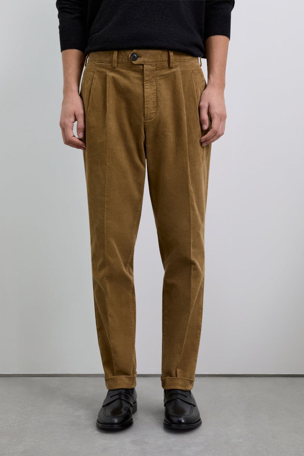 Corduroy chino trousers made of cotton. Loose fit with darts. Concealed zip fastening with an extended button at the waist. Side and back pockets.