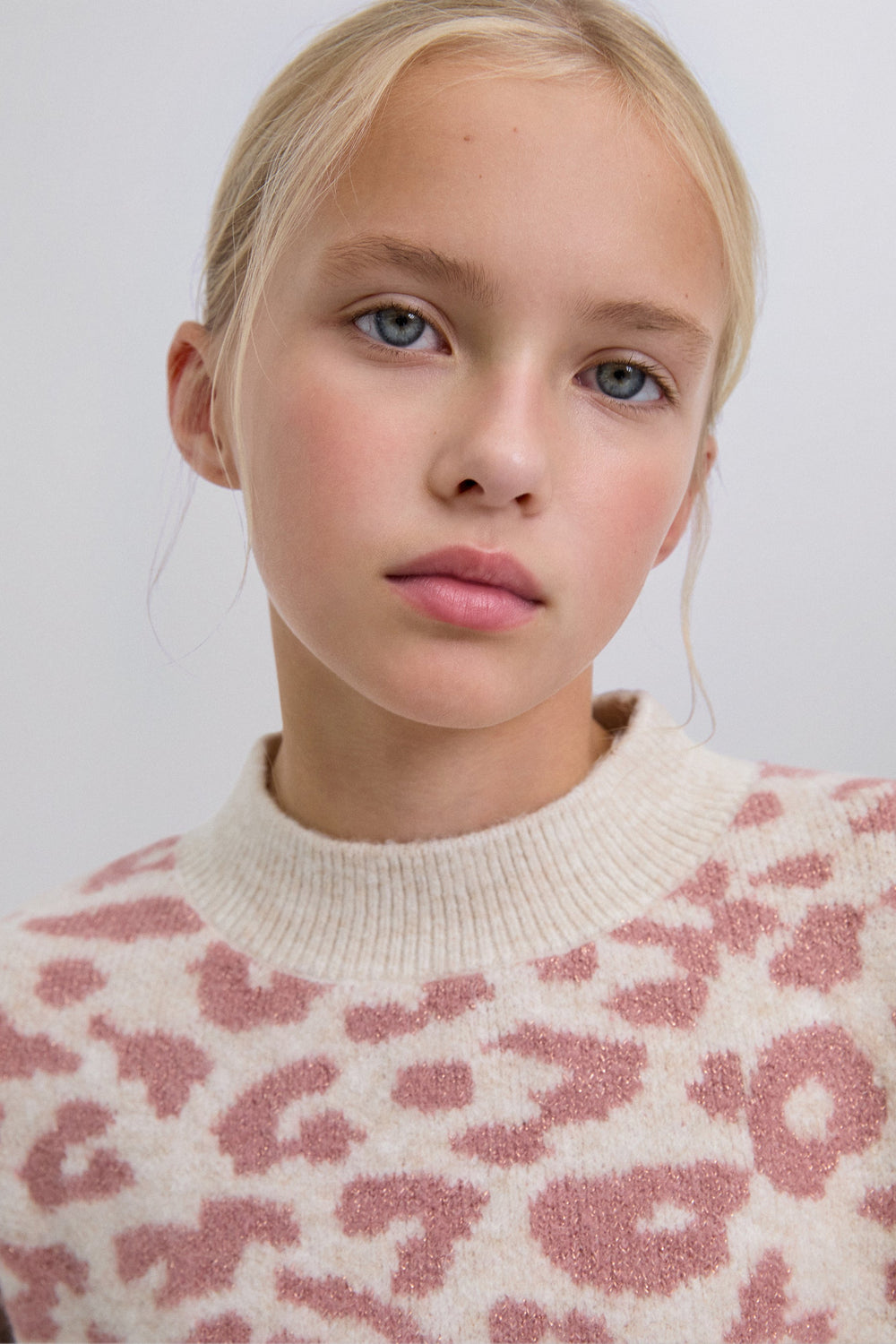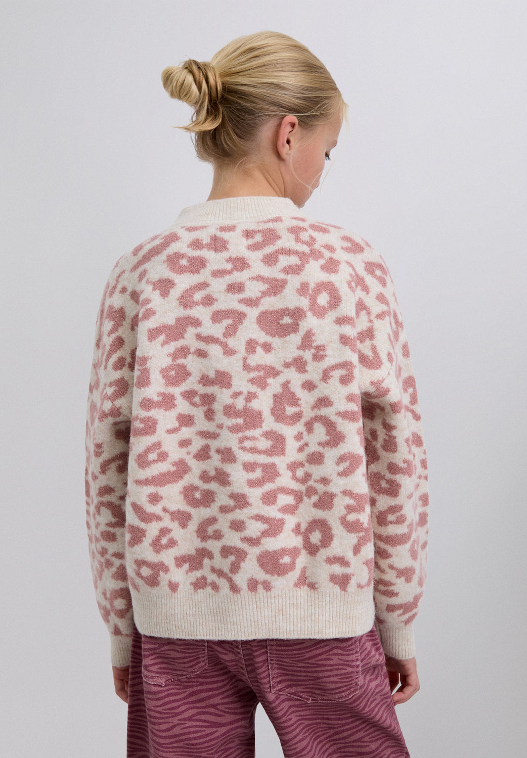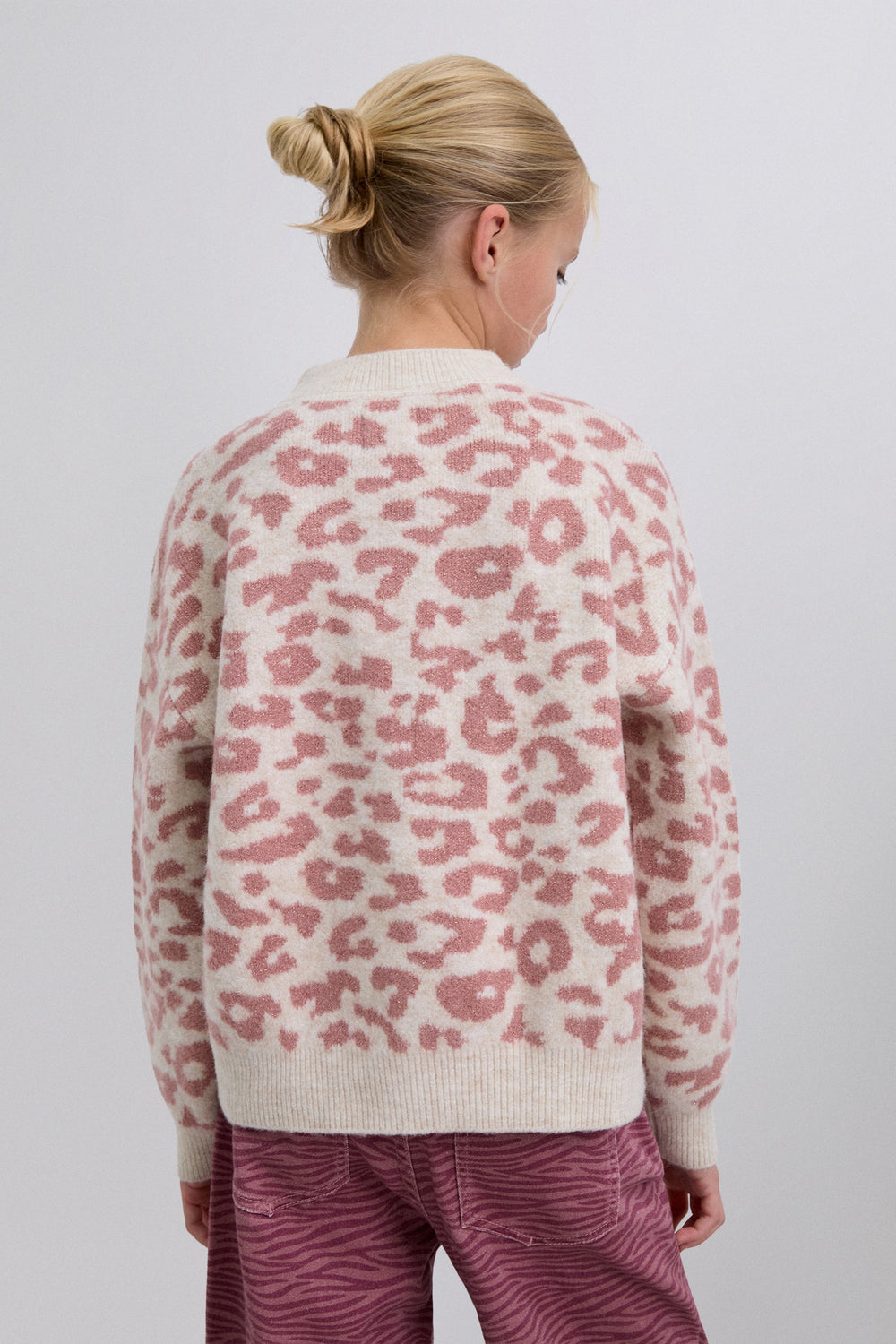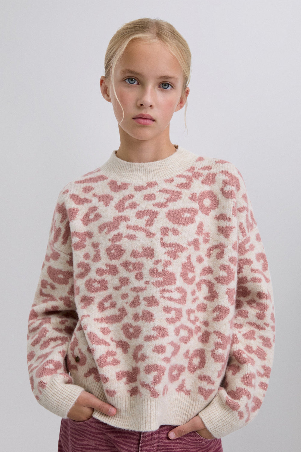Knit sweater. Long sleeves. Round neck. Animal print. Contrast ribbed finish.