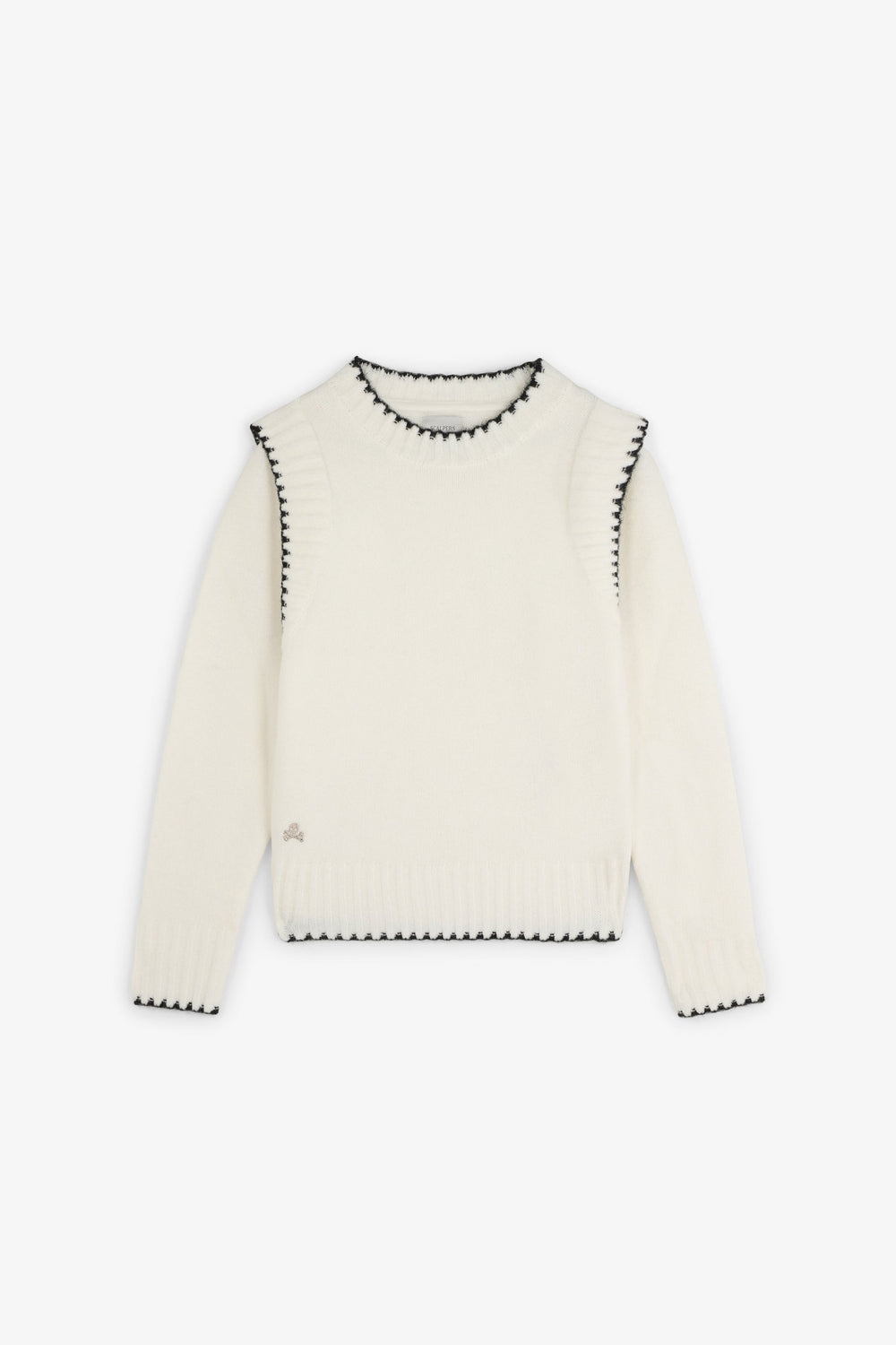 Knit sweater. Round neck. Long sleeves. Contrast embroidered skull detail. Ribbed trim.