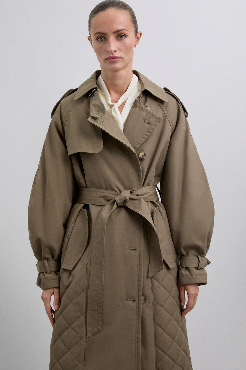 Coat quilted, waterproof trench coat made of cotton. Quilted detail at the bottom. Voluminous sleeves and cuff tabs. Front button fastening and adjustable belt.