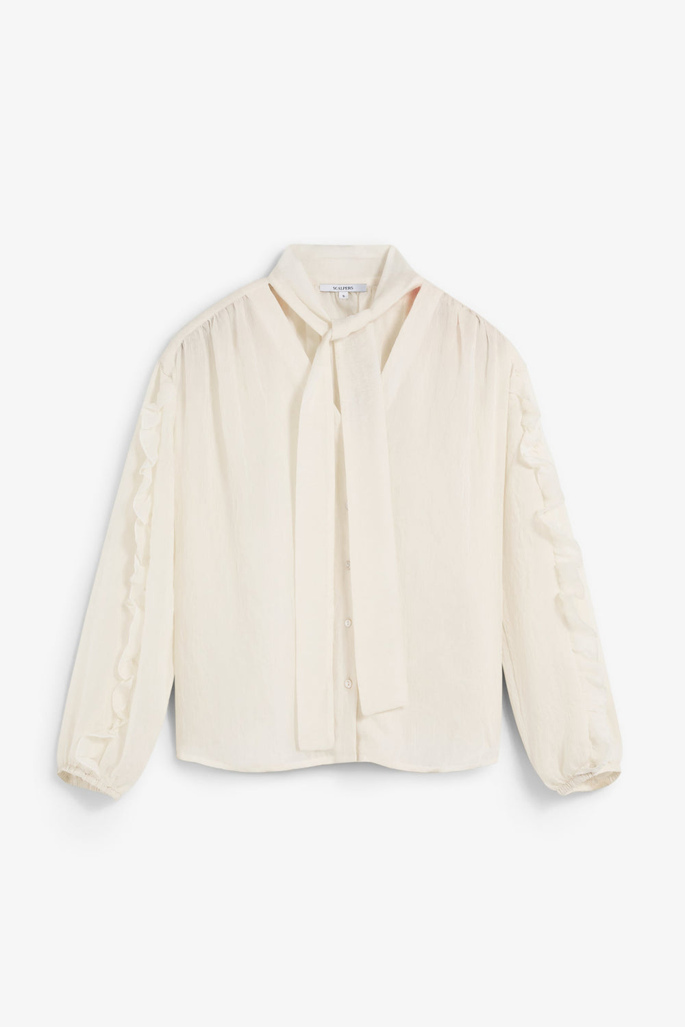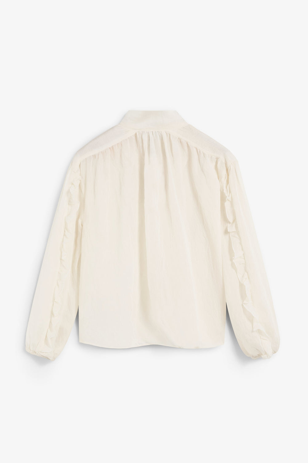 Blouse made of flowing fabric with linen and rayon. Regular Fit. Neckline with tie detail. Front button fastening. Long slightly puffed sleeves with cuffs. Ruffle detailing on the sleeves.