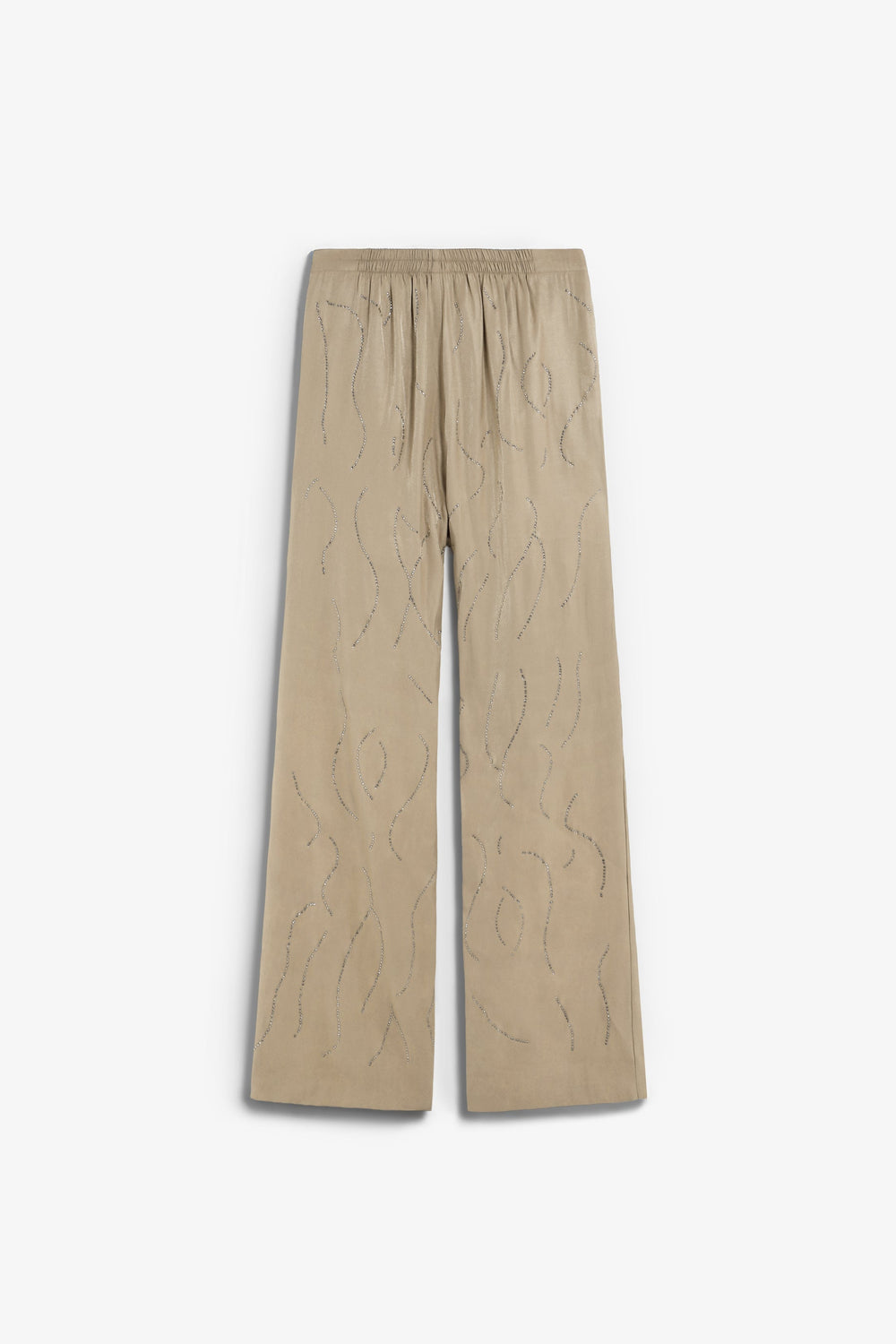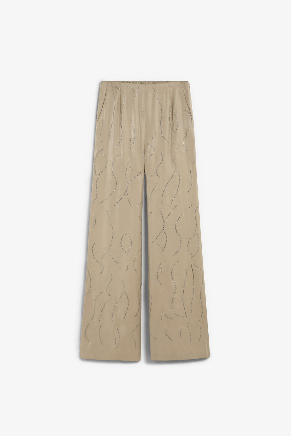 Trousers with rhinestone detailing. Elasticated waistband. Flowing fabric with satin finish. Side pockets.