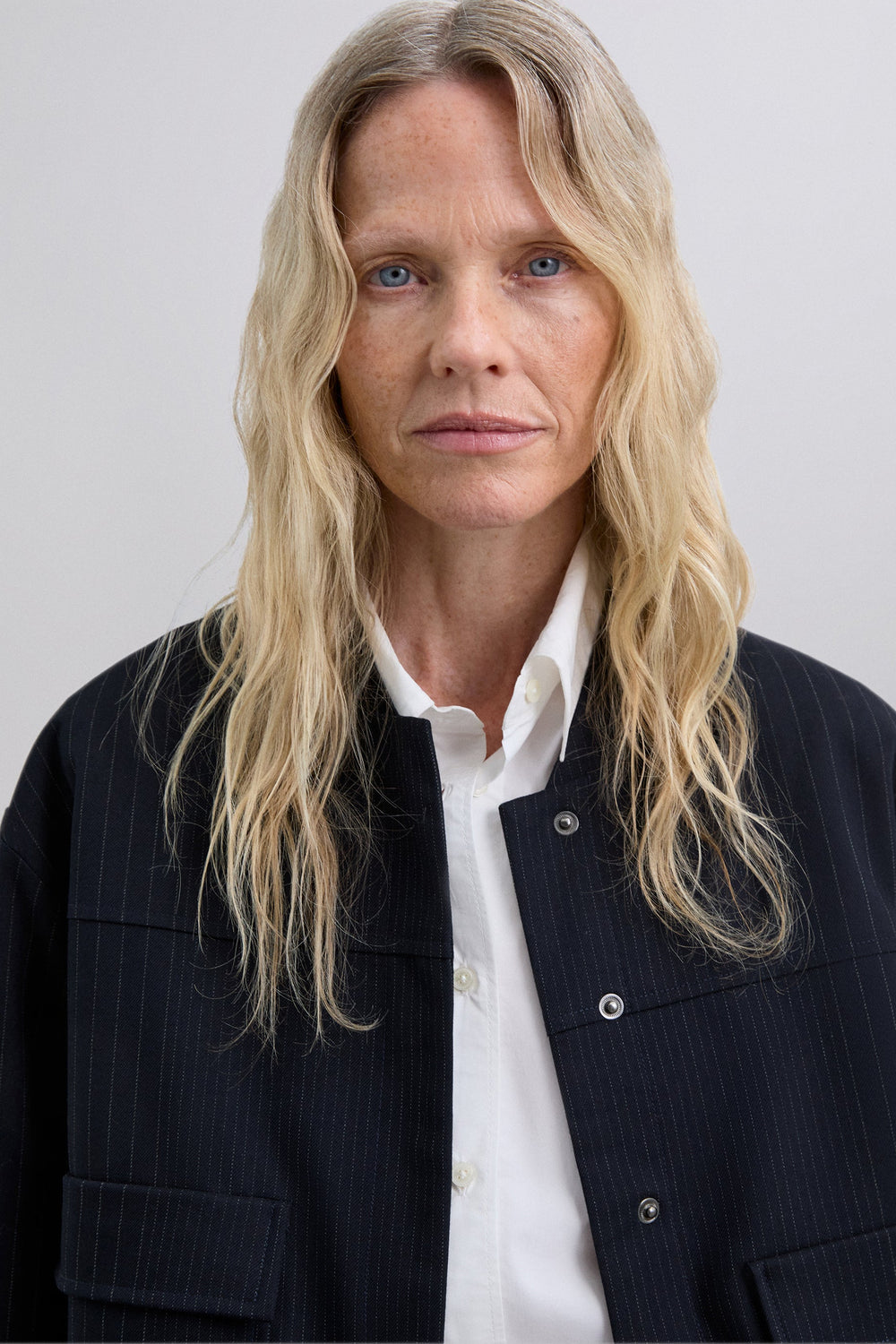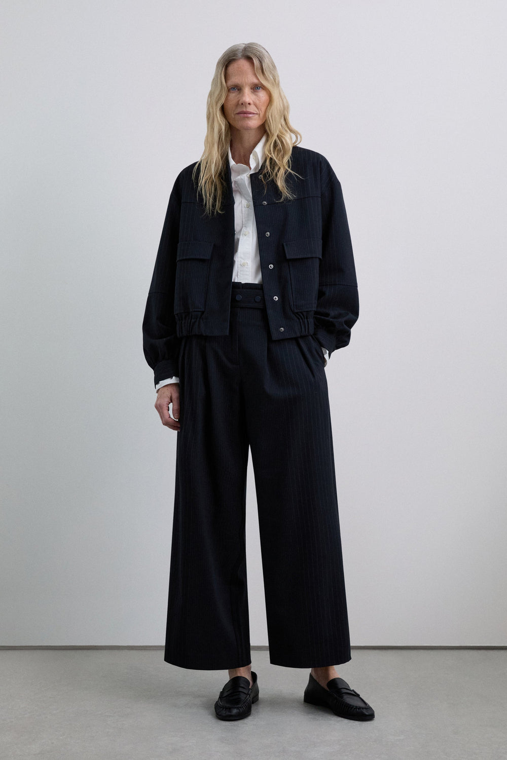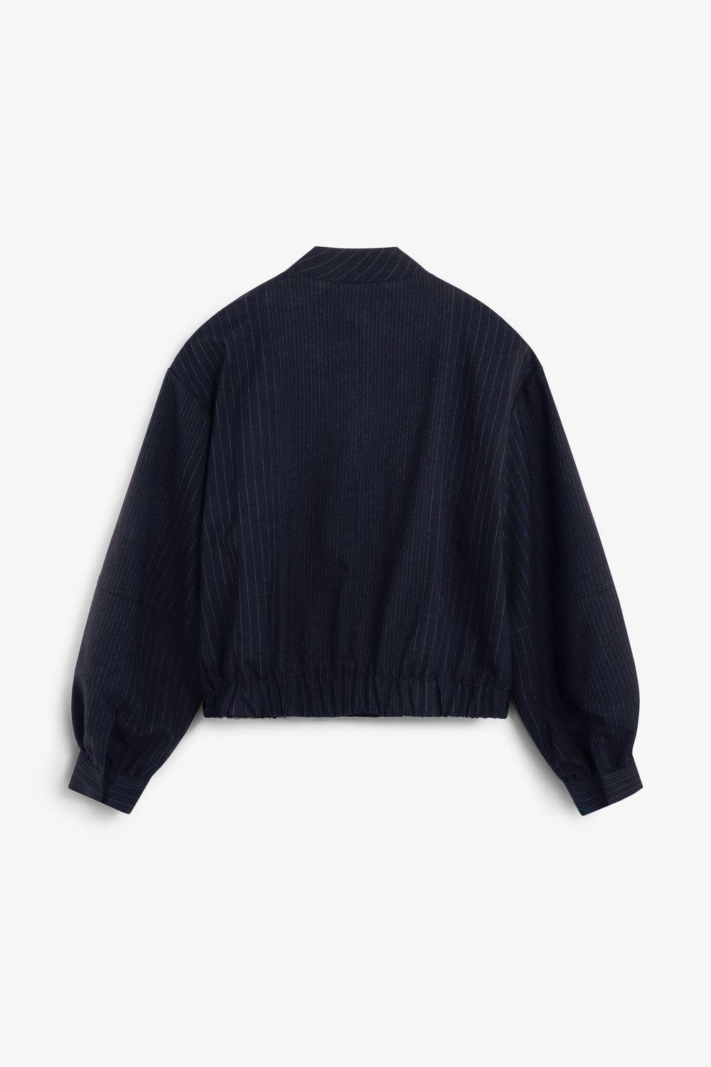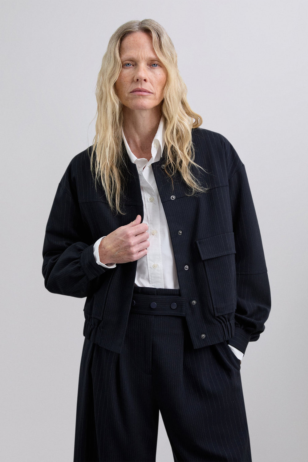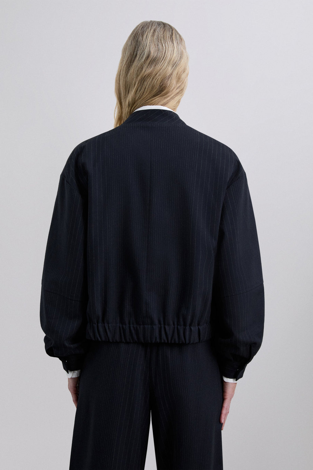 Pinstripe bomber jacket. Shirred stand-up collar. Long sleeves. Slightly stretchy waist. Front zip and button fastening. Two back pockets with flaps.