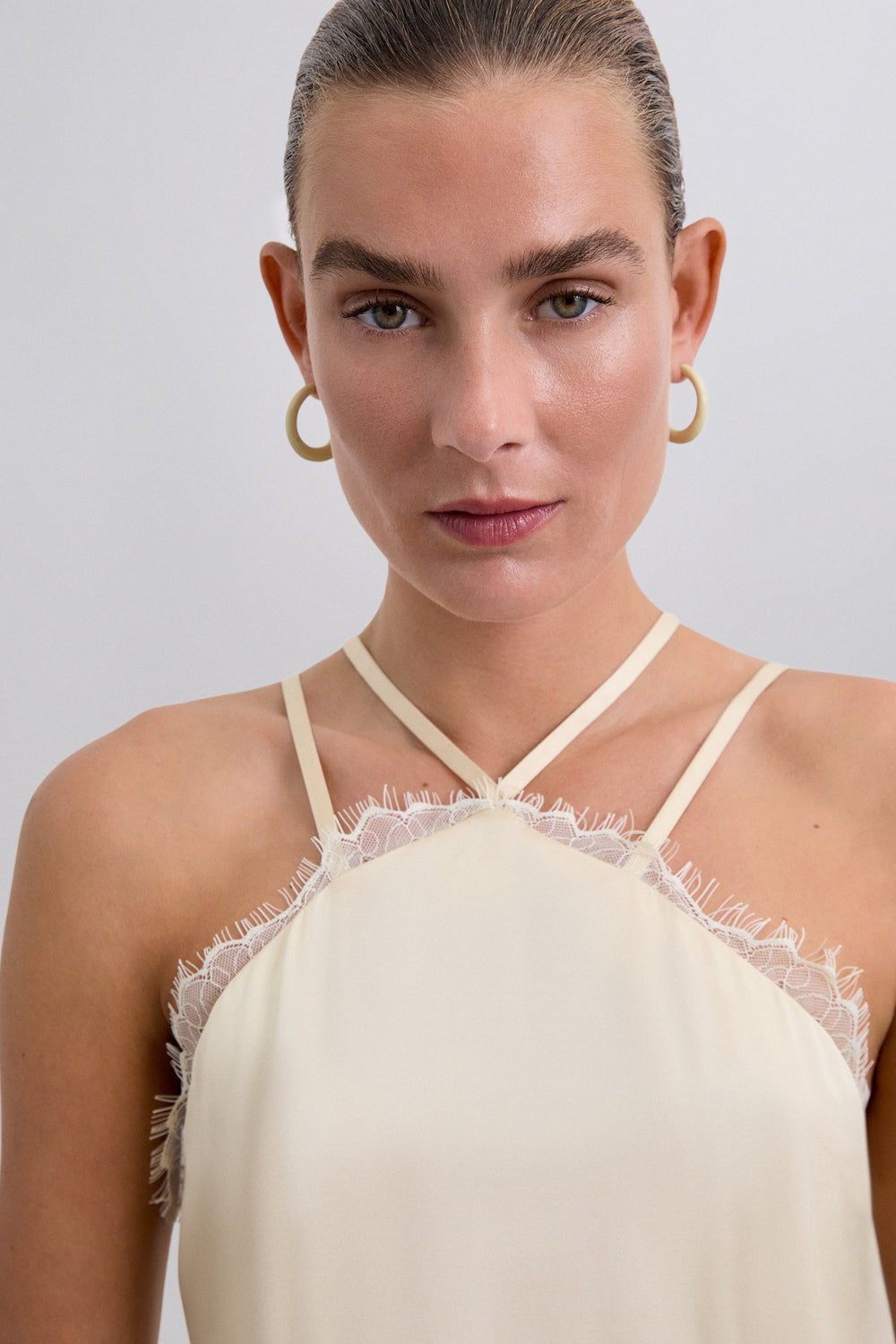 Flowing fabric midi dress with satin finish. Thin straps. Lace detail on the neckline. Asymmetric motifs. Slit on hem.