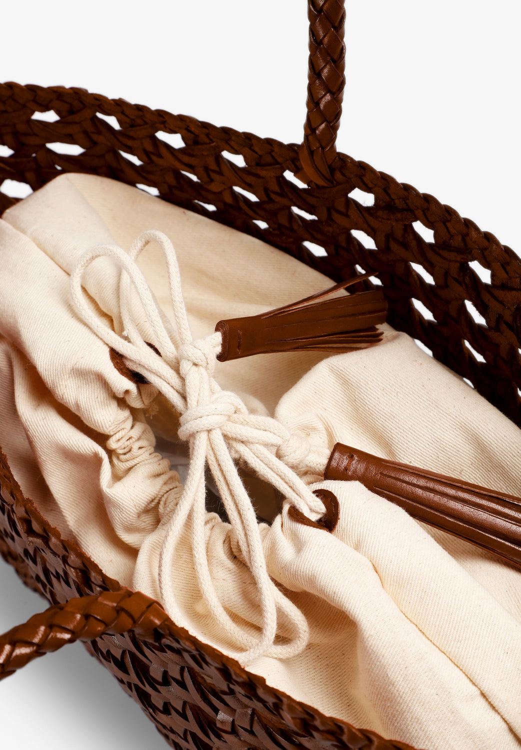 Braided bag made of 100% leather. Cotton lining and adjustable knot fastening.