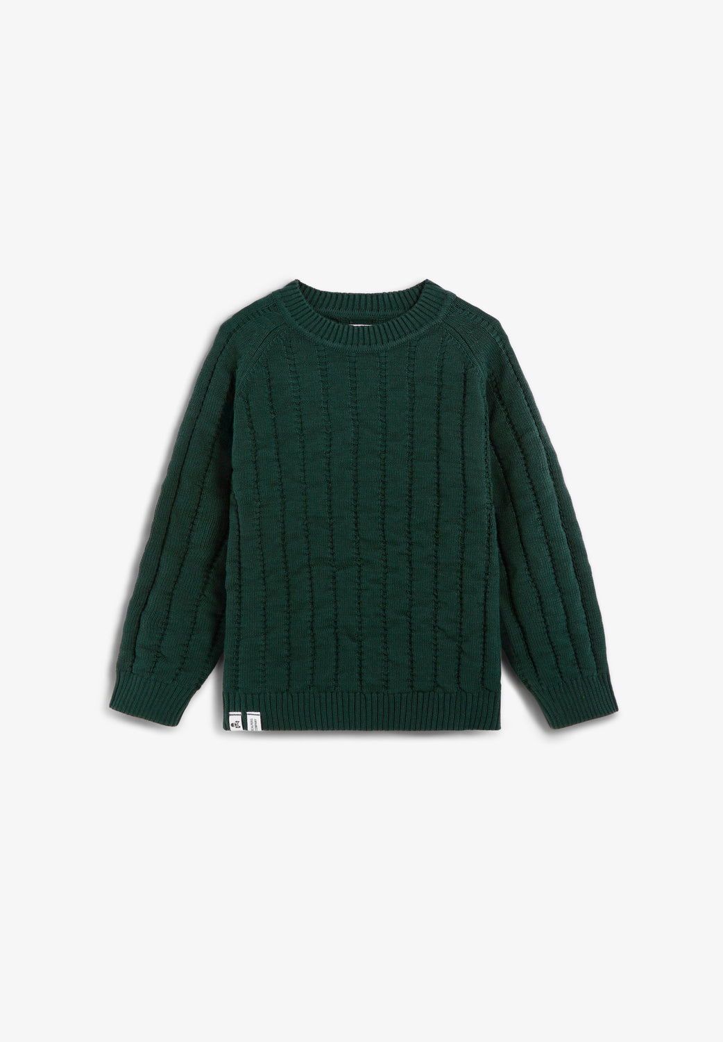 Long sleeve knitted round neck sweater made of 100% BCI cotton. Textured fabric with ribbed trim.