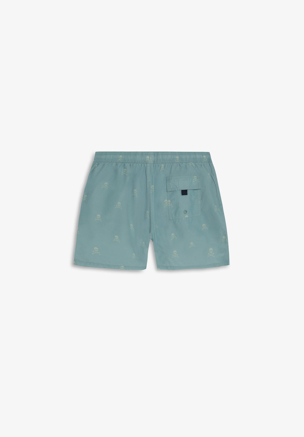 Swimming trunks with elasticated waistband and drawstring. Side pockets. Contrast skull print. Back pocket.
