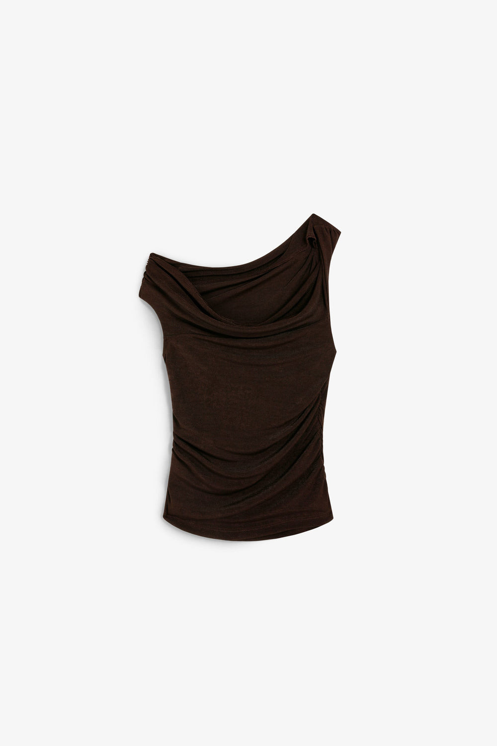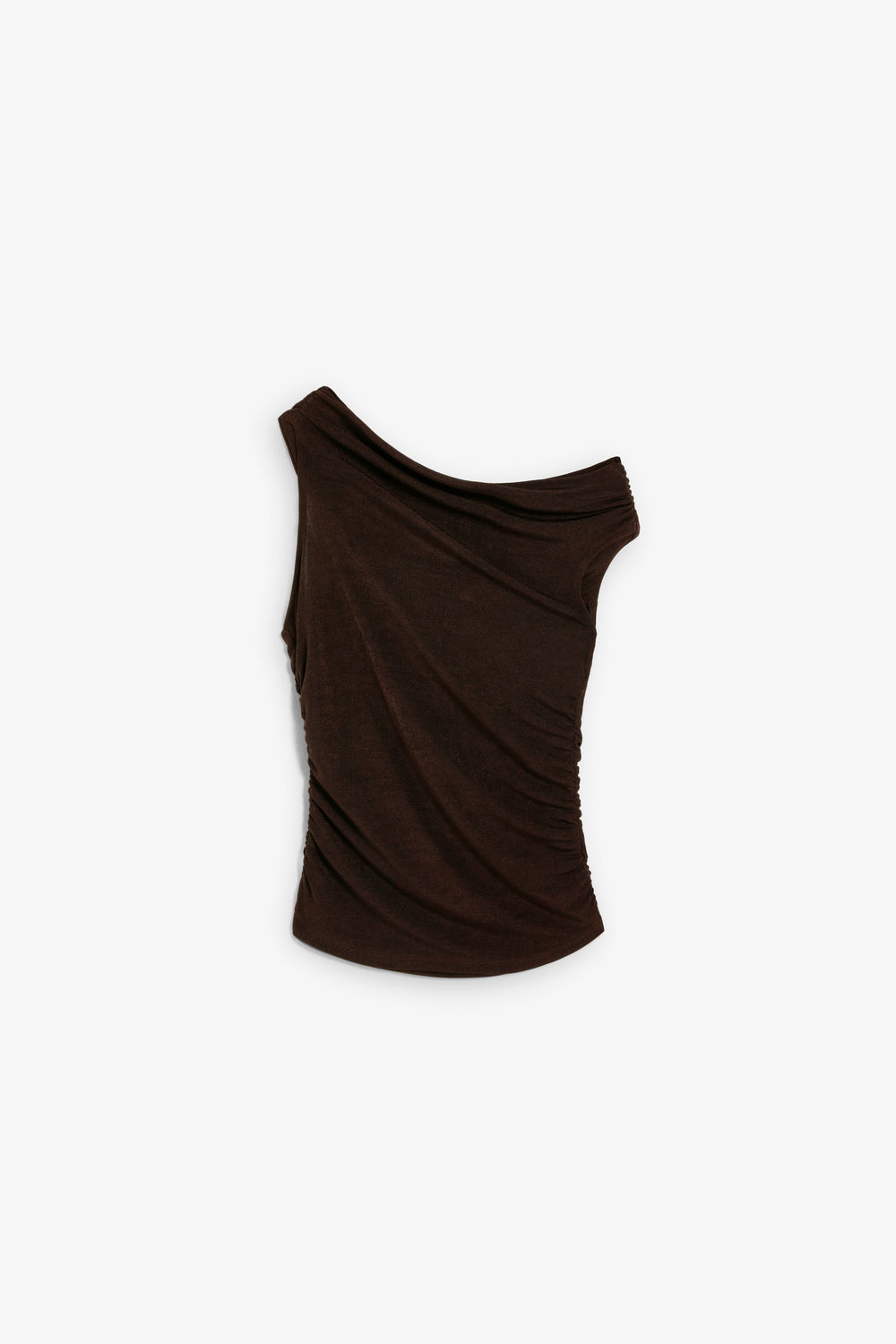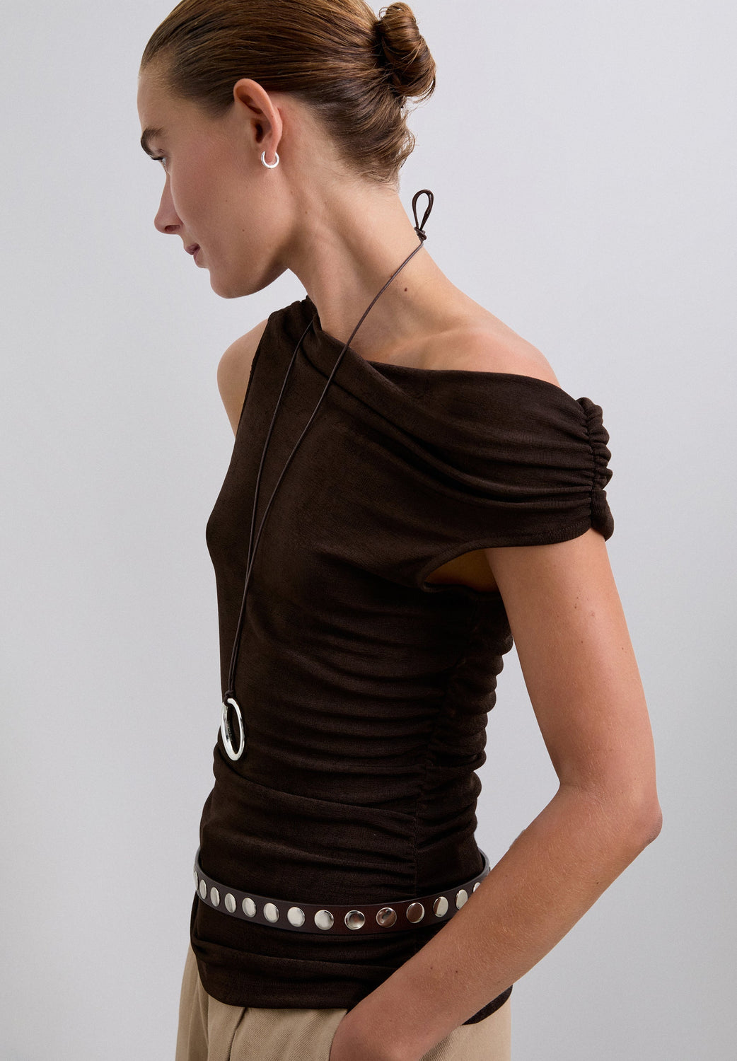 Top made of slightly stretchy fabric. Slim fit, Off The Shoulder, asymmetric neckline with gathers on the sides.