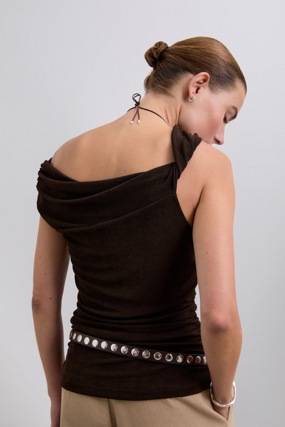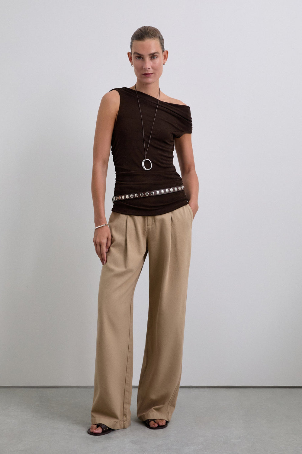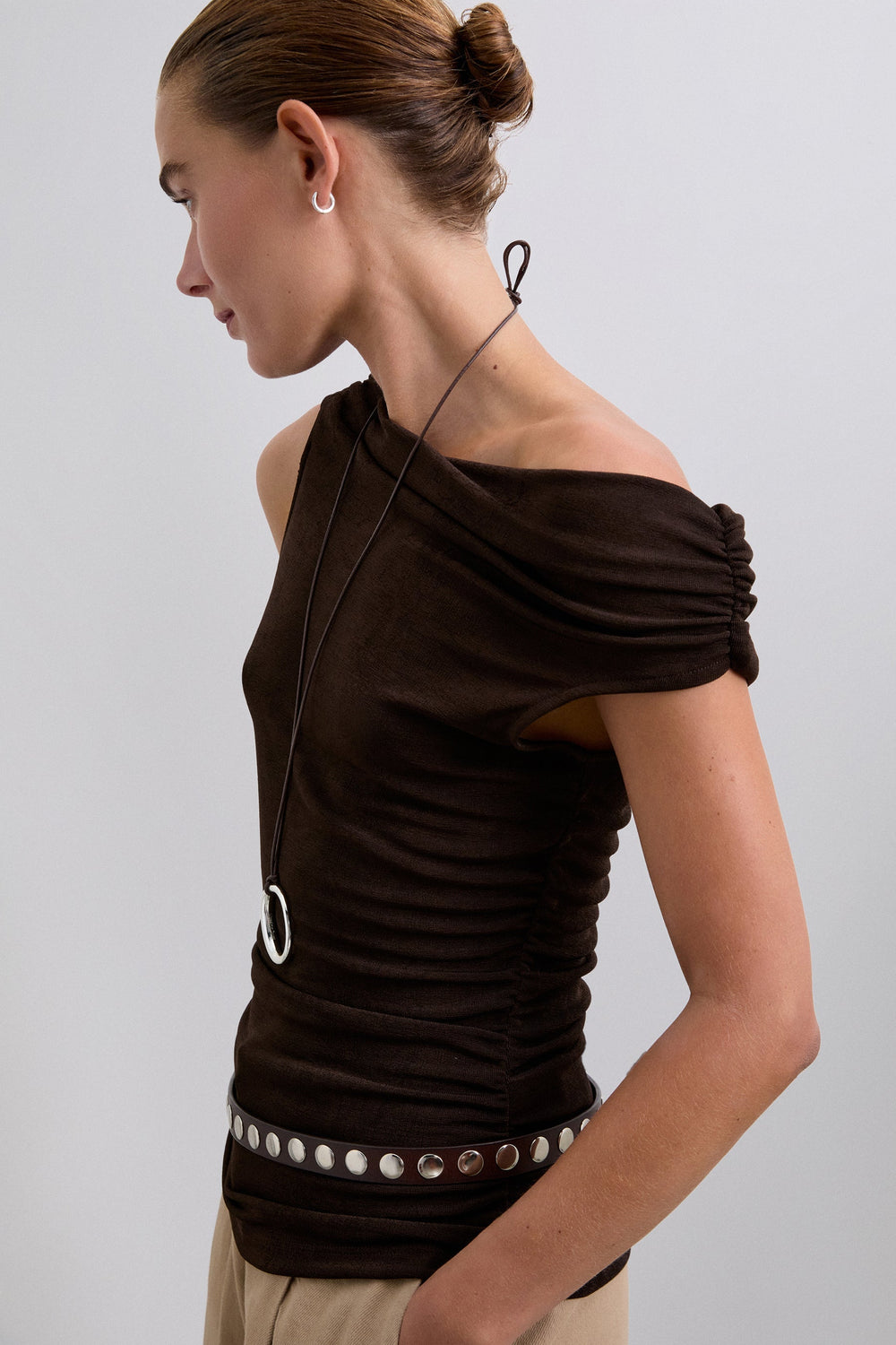 Top made of slightly stretchy fabric. Slim fit, Off The Shoulder, asymmetric neckline with gathers on the sides.
