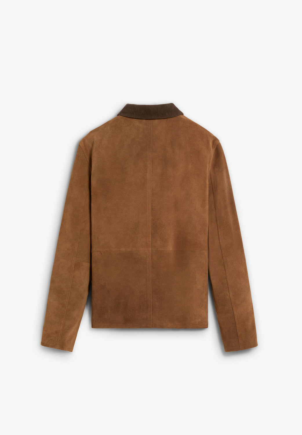 Jacket made of 100% leather. Long sleeves. Corduroy collar. Metal toggle and zip fastening at front. Two buttoned patch pockets.