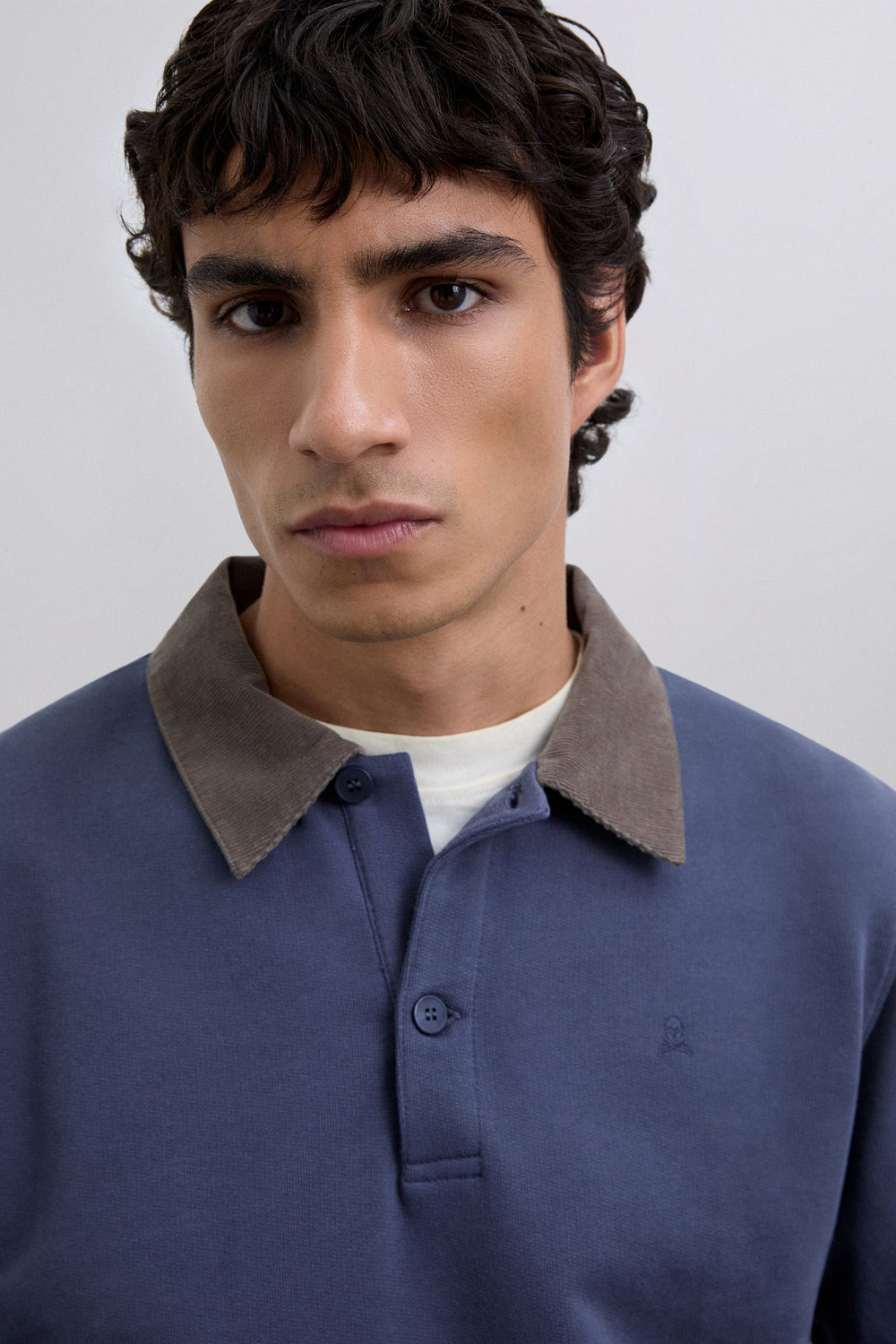 Polo shirt made of 100% BCI cotton. Contrast corduroy collar with button fastening. Long sleeves. Matching embroidered logo on the chest.