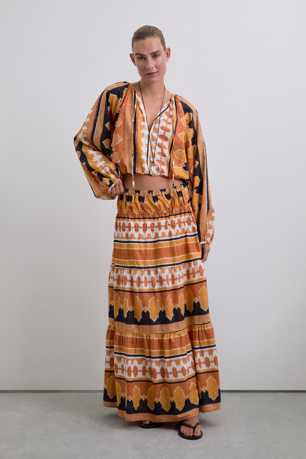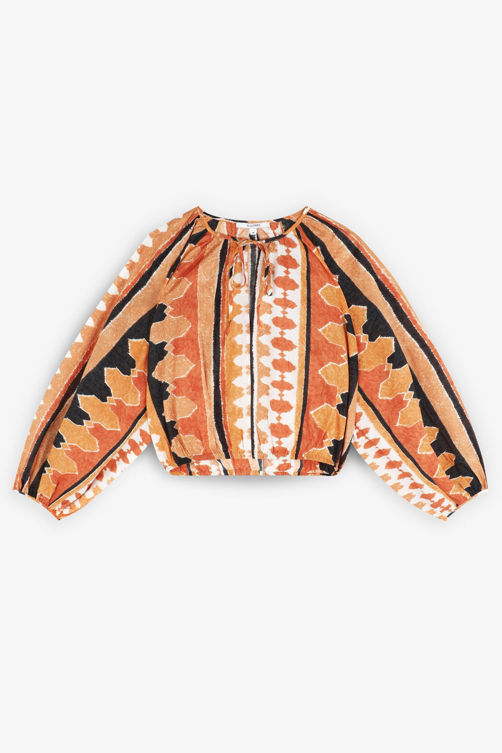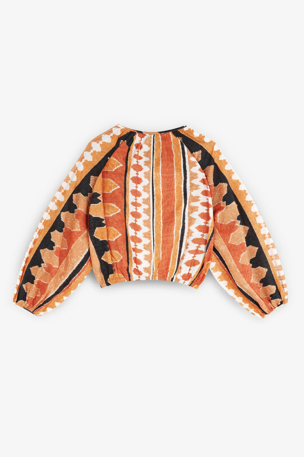 Printed shirt made of 100% organic BCI cotton. Cropped Adjustable V-neck with lacing. Long puffed sleeves. Gathered edge detailing.