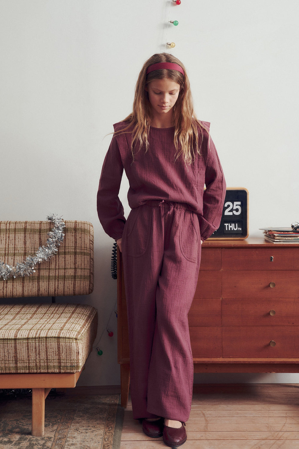 Blouse made of BCI cotton. Round neck. Front pleats. Ribbed details. Long sleeves. Elasticated cuffs. Back button fastening.