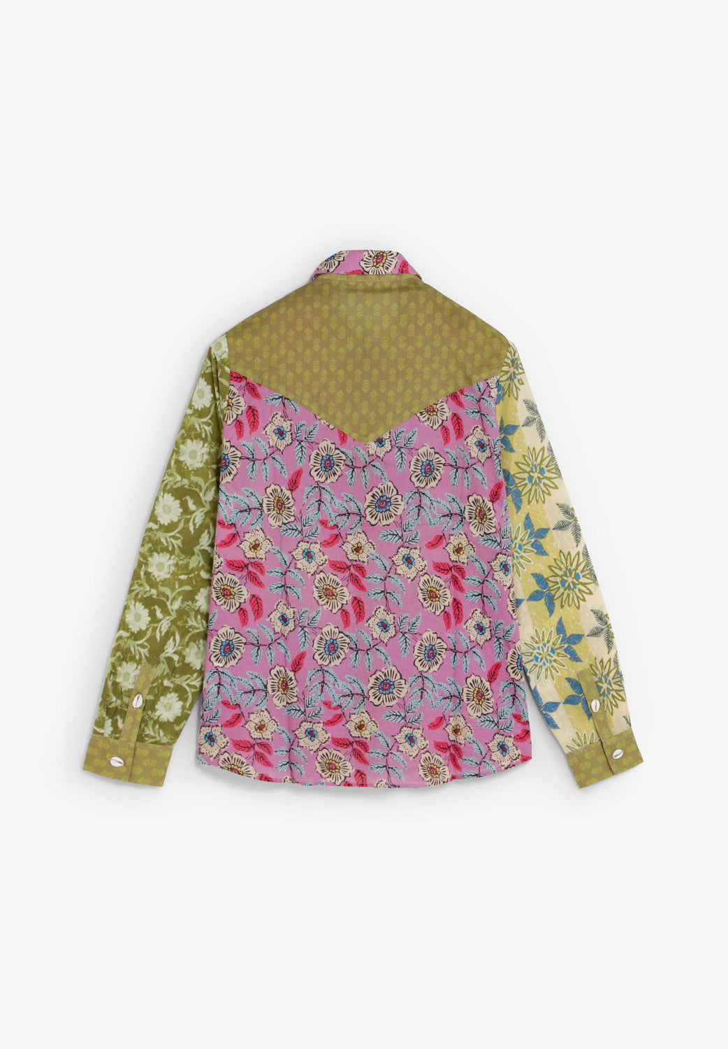Shirt made of lightweight multicoloured patchwork print fabric. Shirt collar and front button fastening. Long sleeves with buttoned cuffs. Patch pocket on the chest. Straight, slightly loose-fitting design with rounded hem.