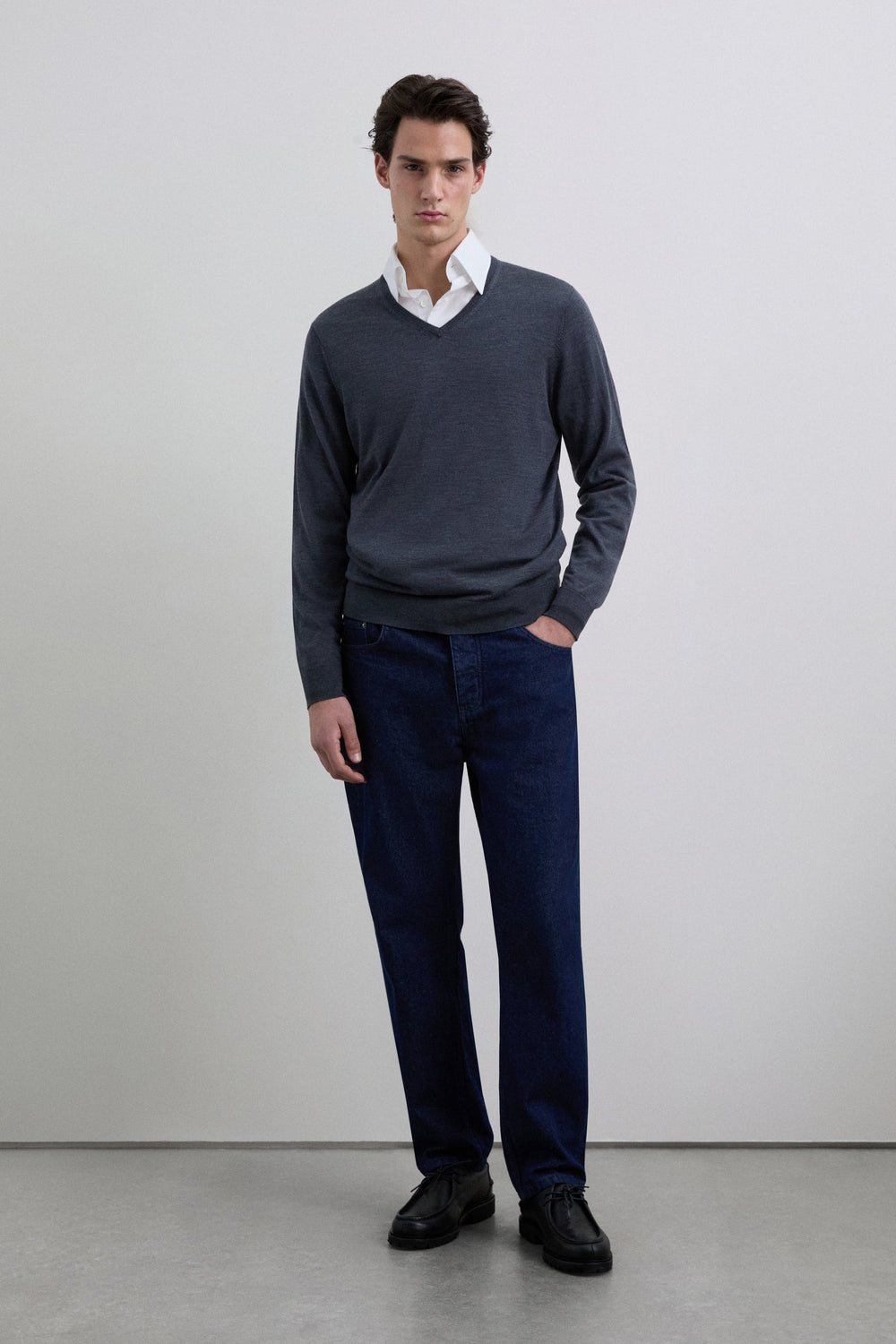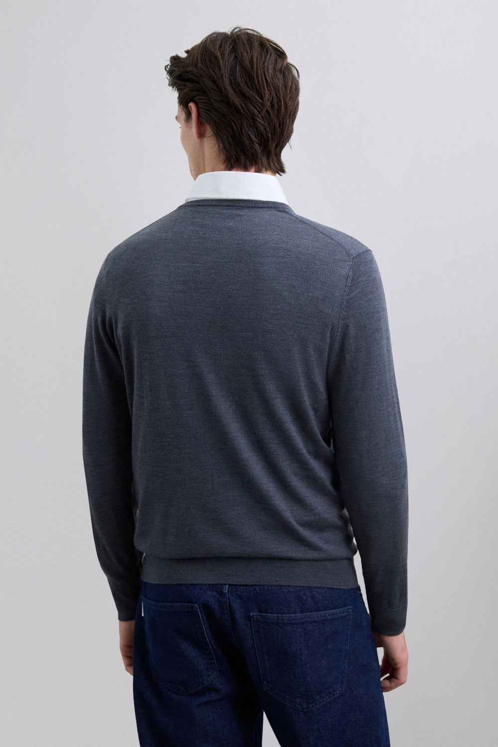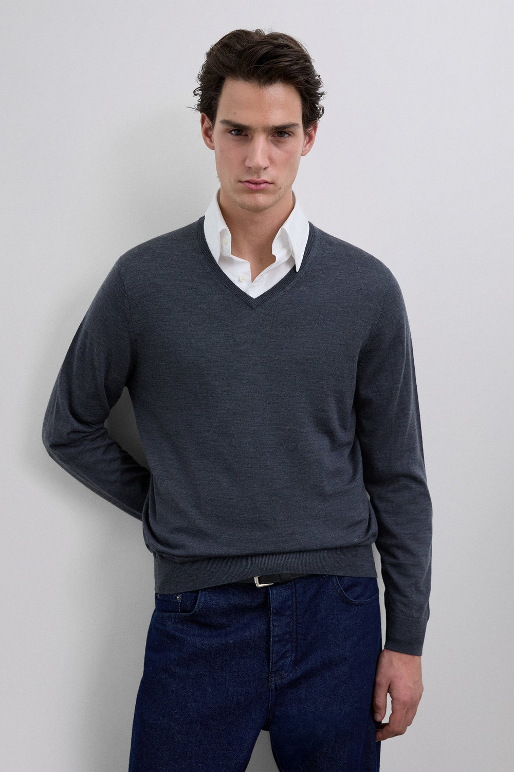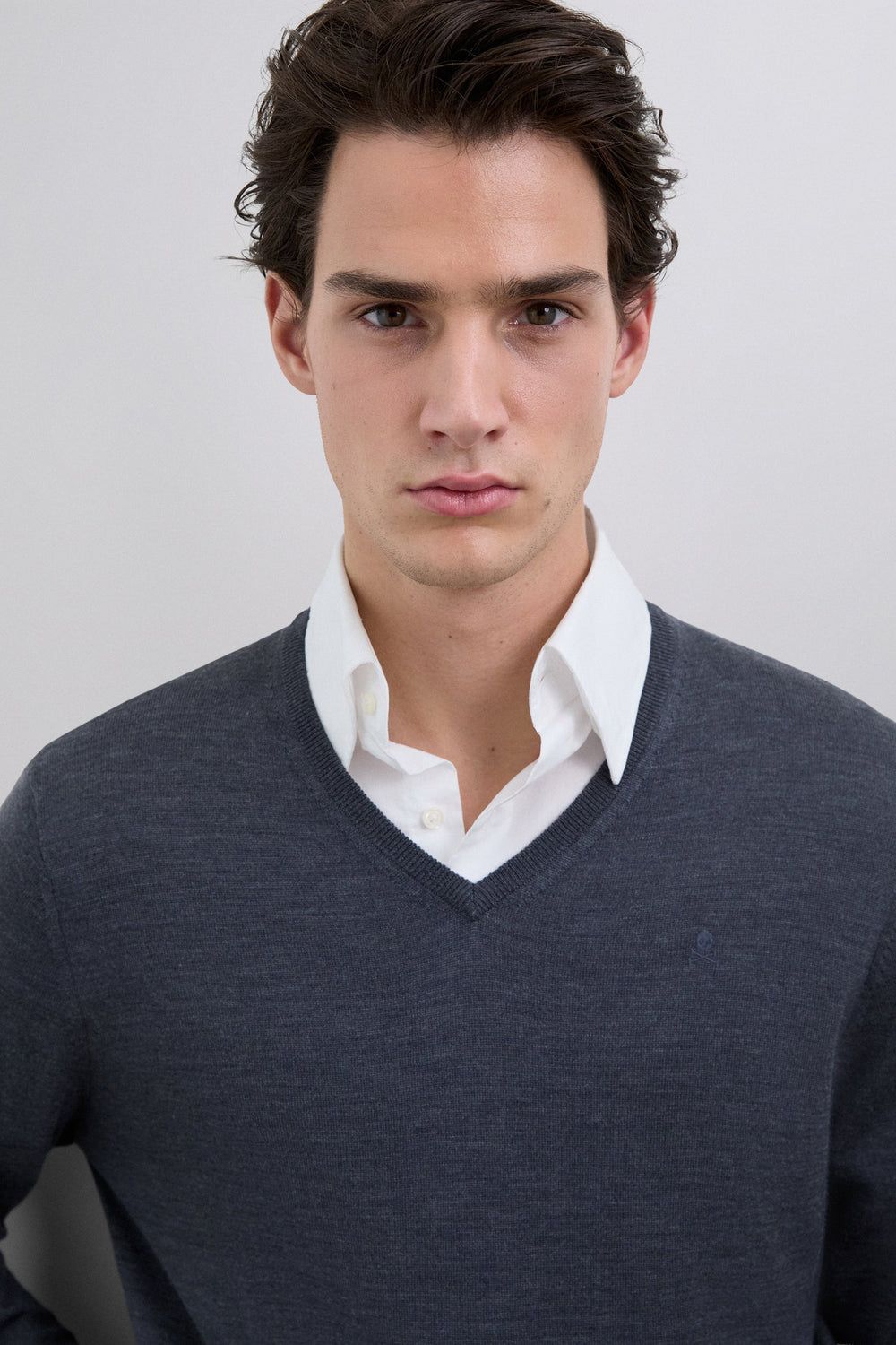 Sweater made of 100% wool. Regular Fit. V-neck. Long sleeves. Matching embroidered skull detail on the chest. Ribbed trim.