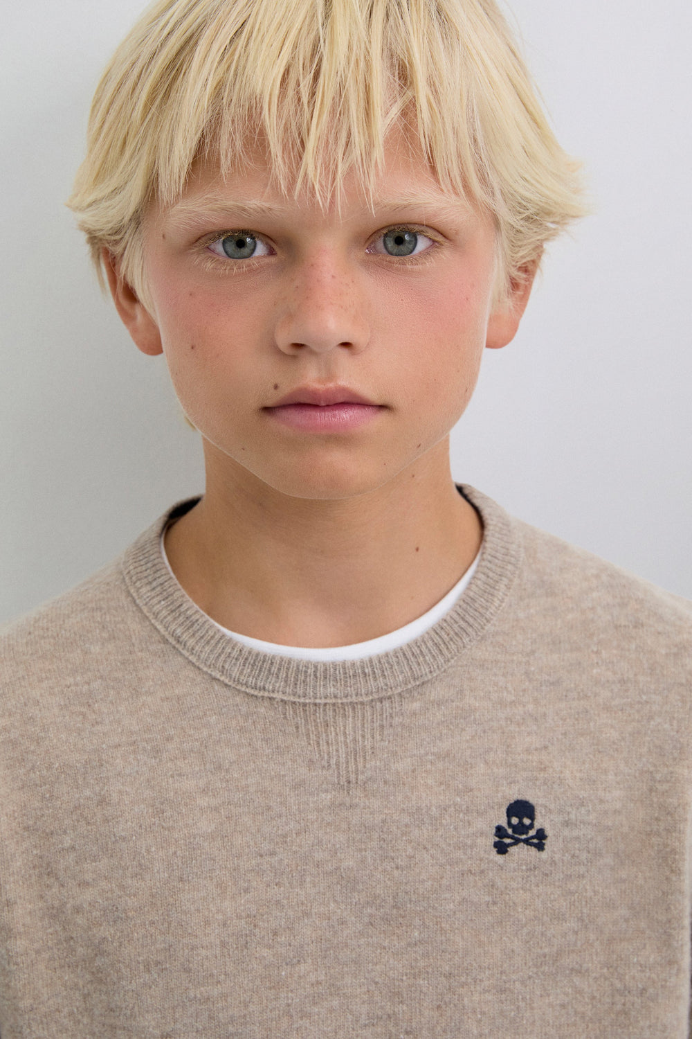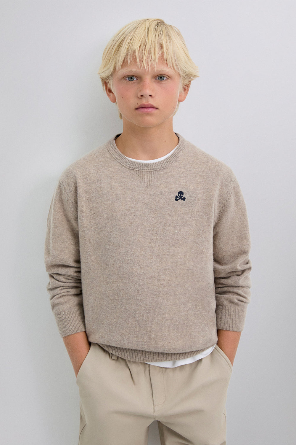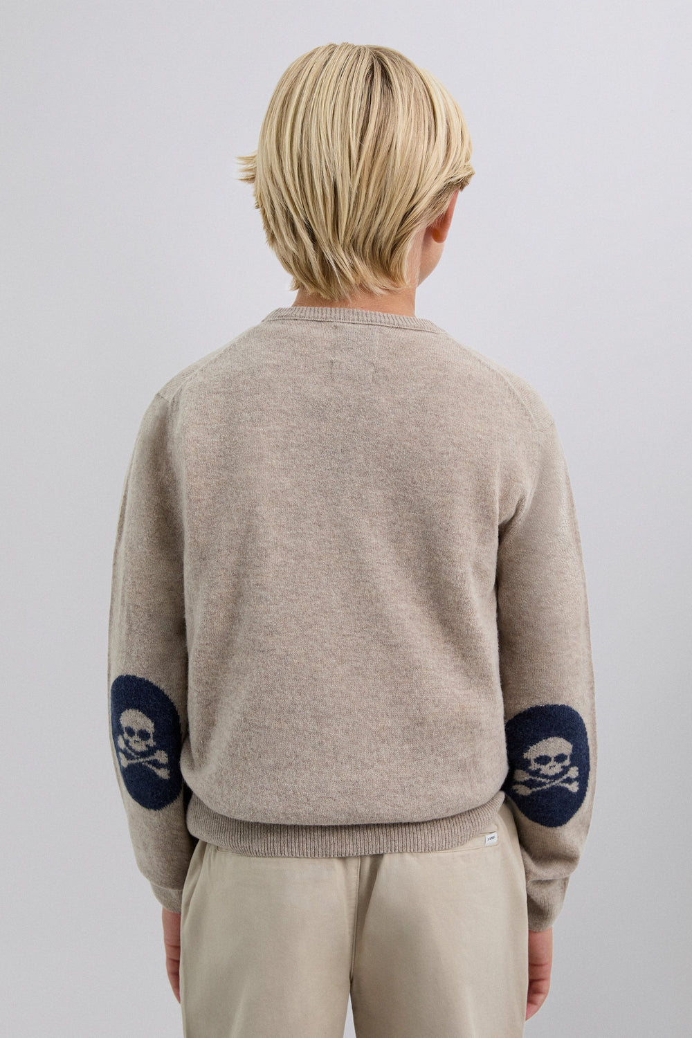 Sweater made of wool and polyamide blend. Regular fit. Round neck. Long sleeves. Contrast embroidered skull detail. Ribbed trim. Skull patch detail on the elbow pads.