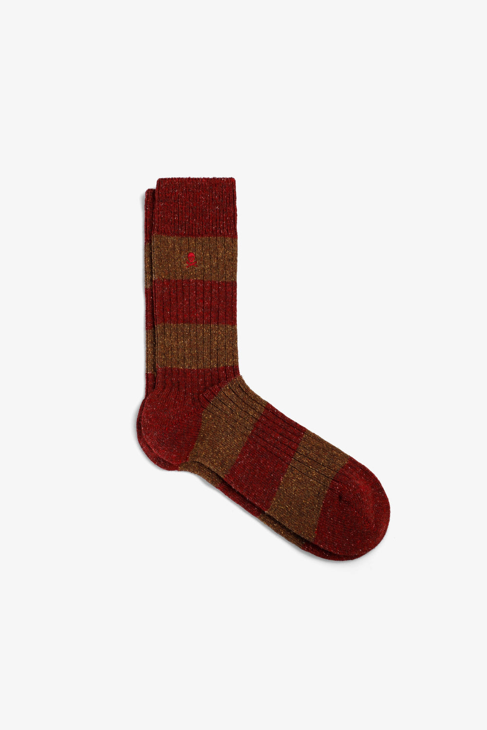 Mid-calf socks made of wool and silk. Stripe print. Contrast embroidered logo at the top.