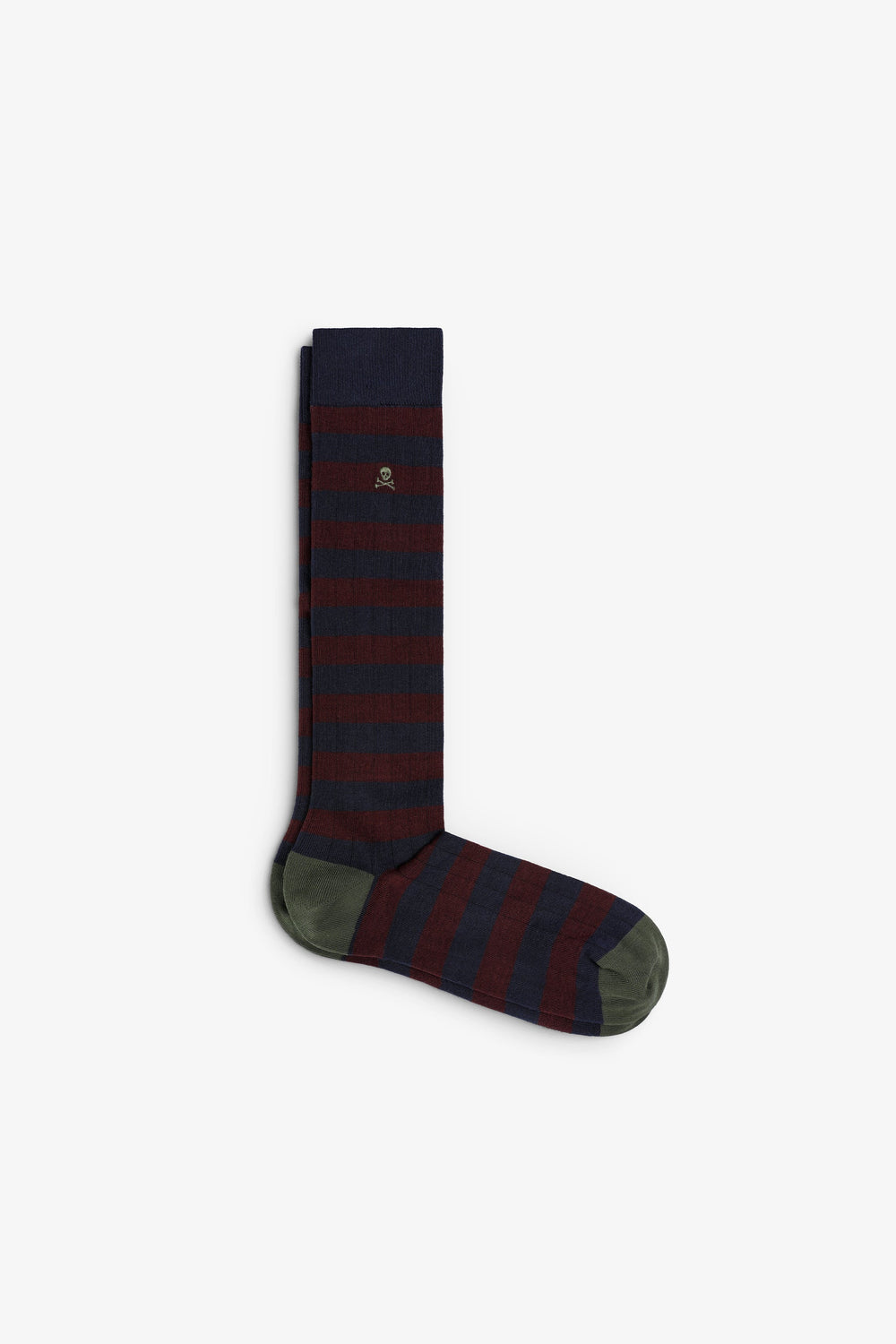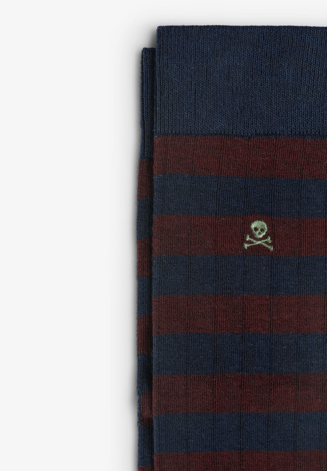 Socks made of an organic cotton blend. Stripe print. Contrast embroidered skull detail. Height: 36cm / Foot length: 23 cm.