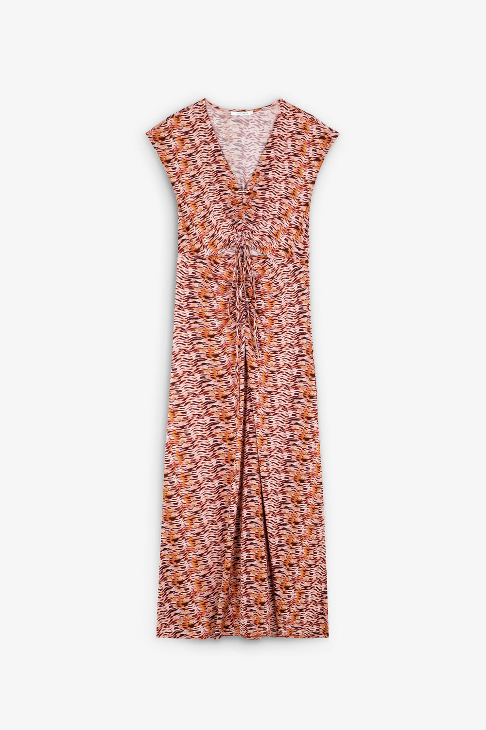 Flowing printed dress with cut out at the chest. Short sleeve. V-neck. Adjustable front bow detail.