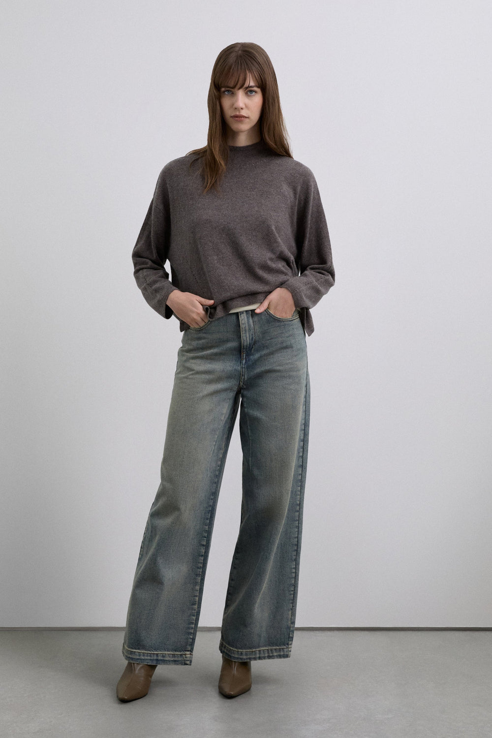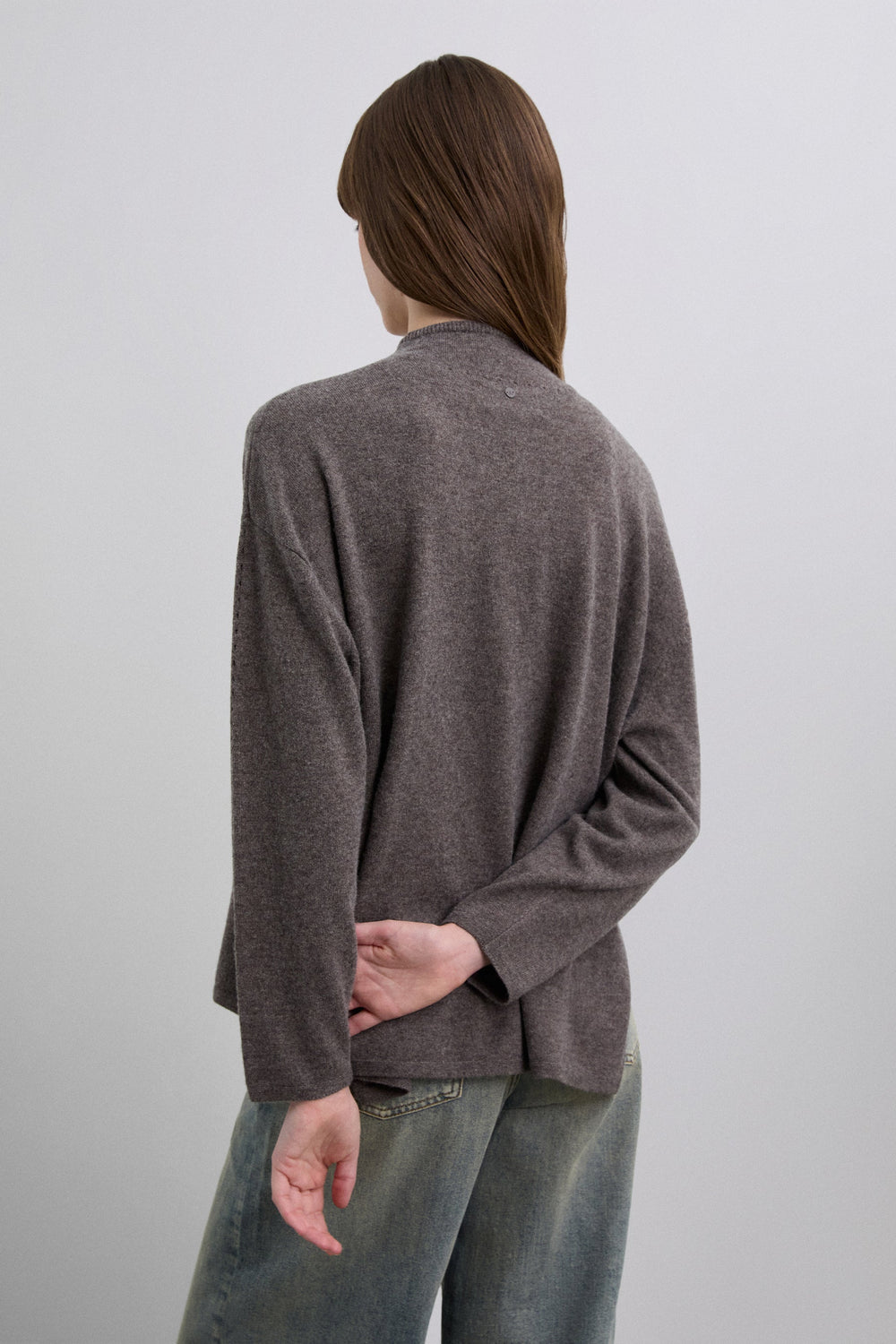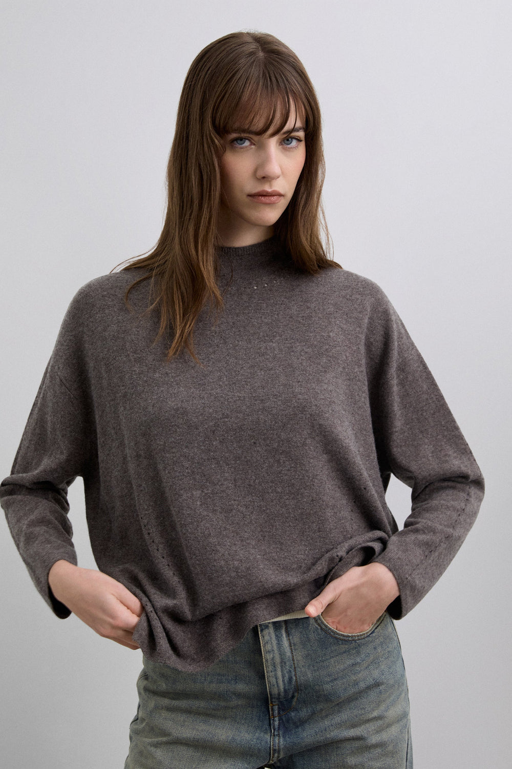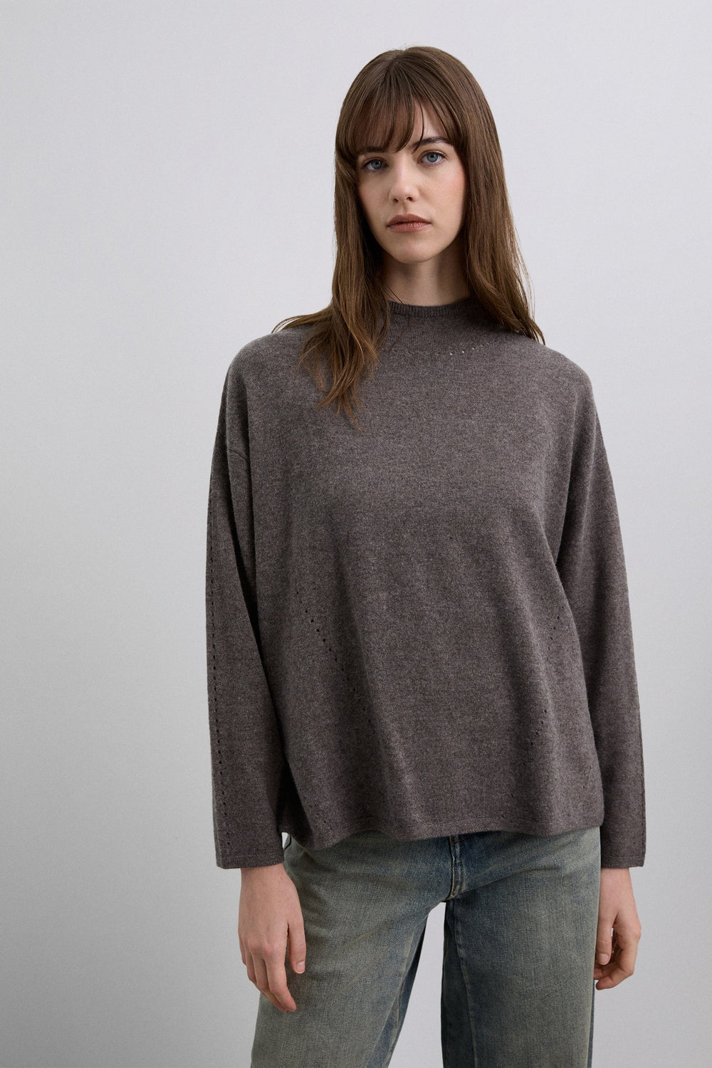 High neck sweater made of a wool blend. Regular fit. Long sleeves. Mini cutout detailing on the front, neck and sleeves.